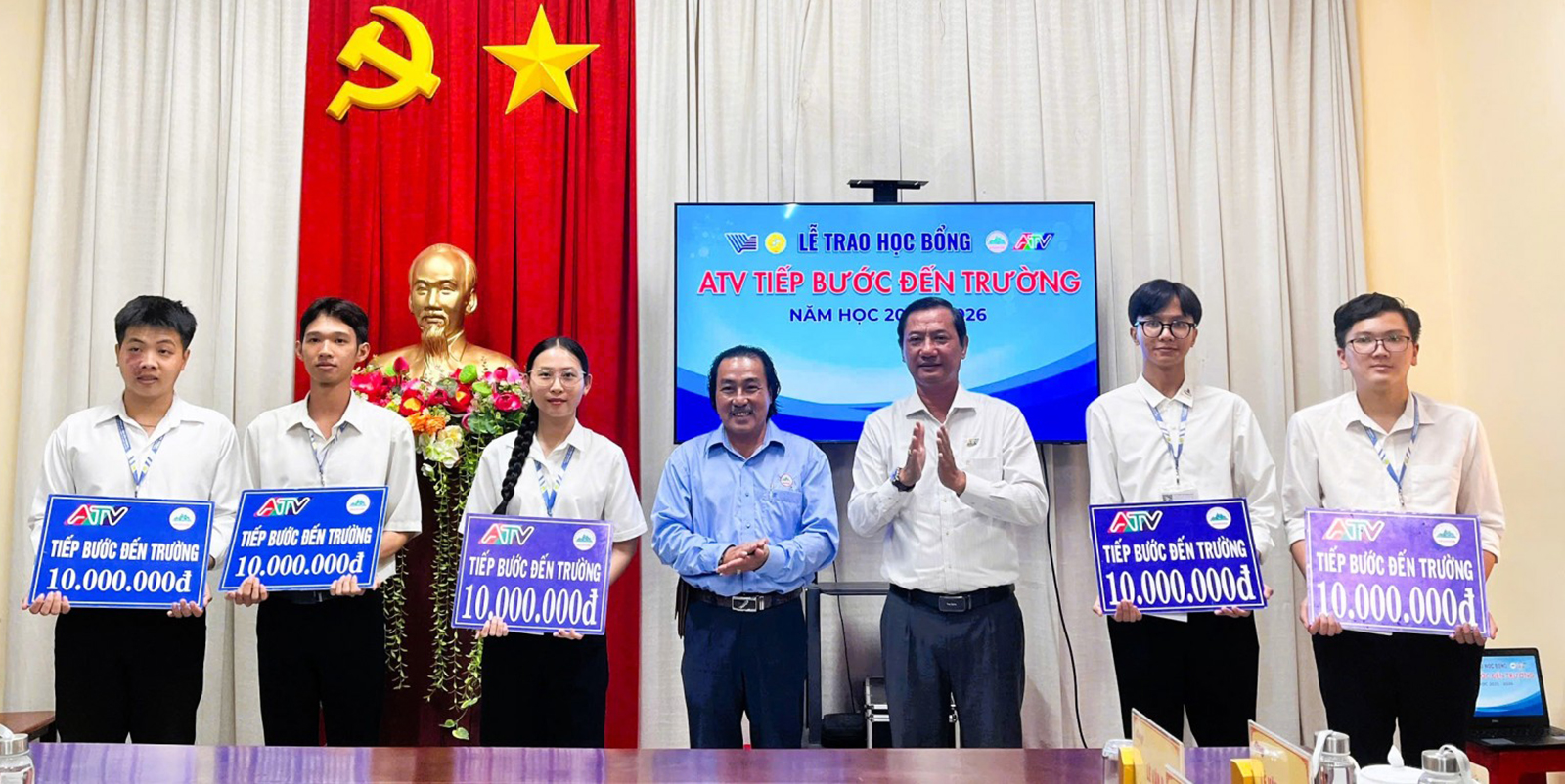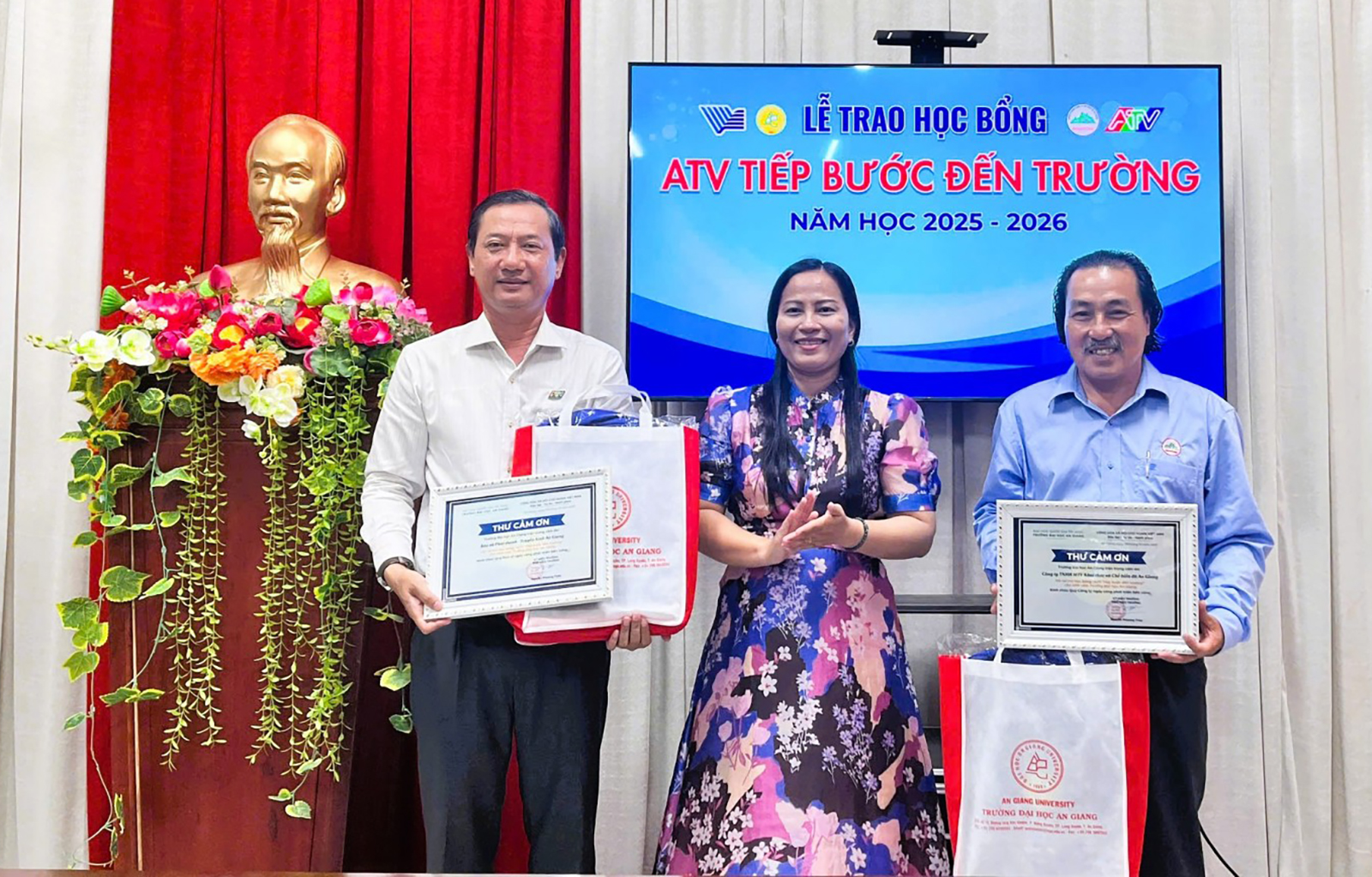 Theo đó, 10 sinh viên tiêu biểu của Trường Đại học An Giang được trao Học bổng “ATV tiếp bước đến trường”. Mỗi suất học bổng trị giá 10 triệu đồng do Công ty TNHH Một thành viên Khai thác và Chế biến đá An Giang hỗ trợ, tổng trị giá 100 triệu đồng.
