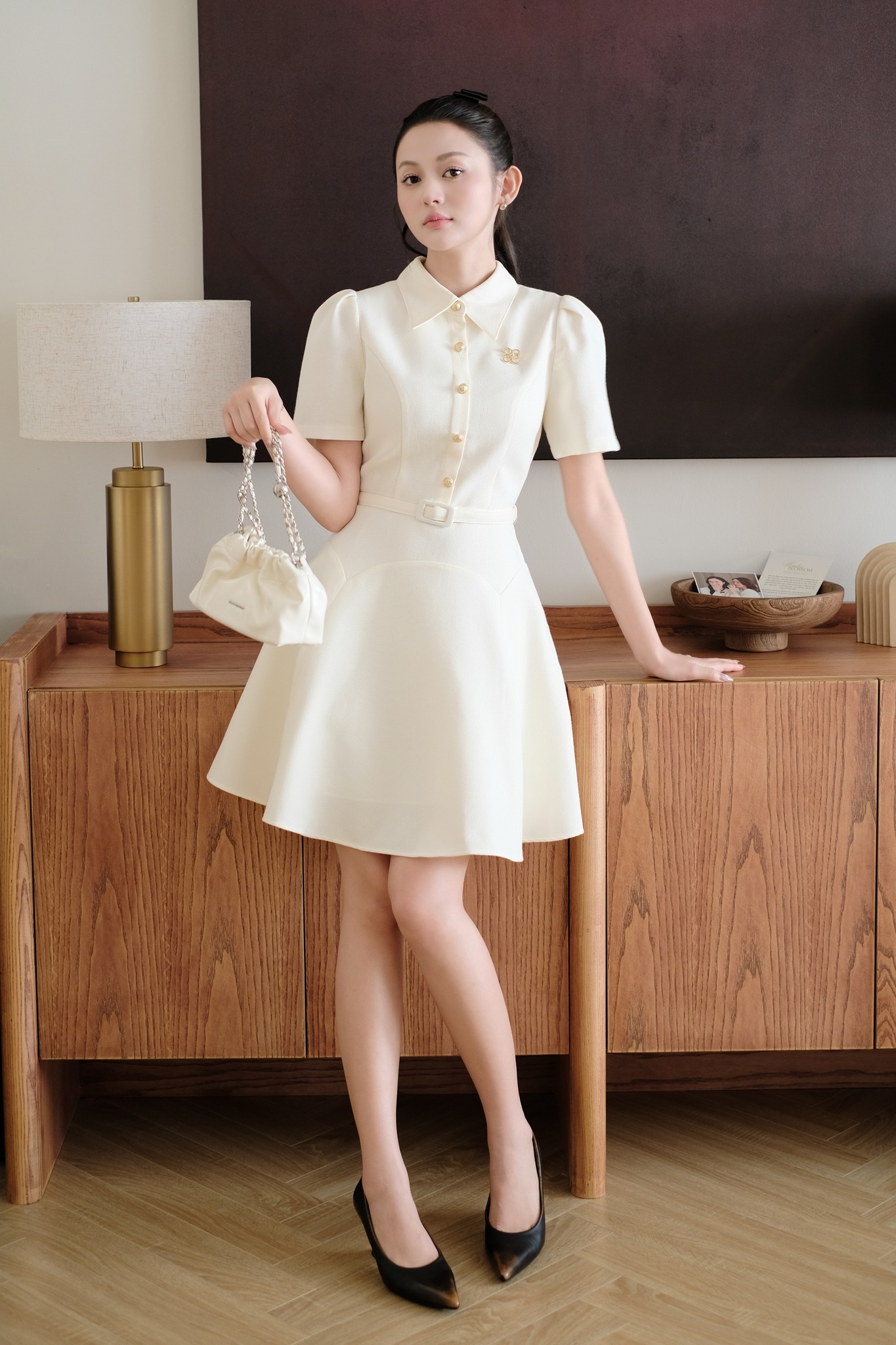 Váy sơ mi màu kem dáng ngắn ứng dụng hoàn hảo phom chữ A cổ điển. Thiết kế giúp nàng khoe khéo đôi chân đồng thời tôn phần thân trên thon thả với cấu trúc tay vai phồng, cổ đứng, đai eo bằng vải... ẢNH: CALIE