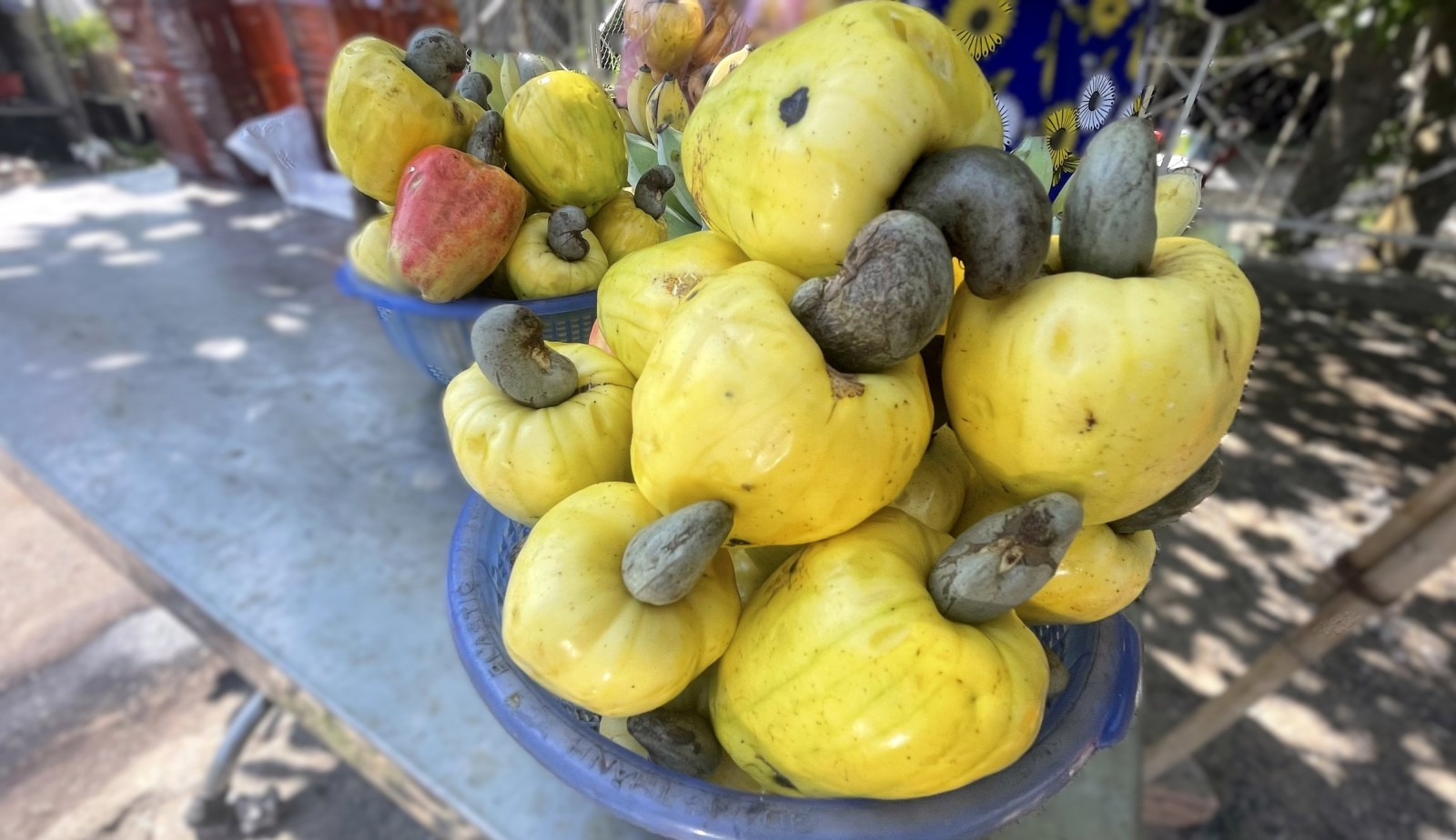 Tại phường Tịnh Biên, mùa này trái đào (điều) lại chiếm ưu thế trên các sạp hàng ven đường. Cứ 10 trái được xếp vào một rổ ngay ngắn. Bà Lê Thị Nghiệp (khóm Phú Hòa, phường Tịnh Biên) xởi lởi giới thiệu: “Trái đào không chỉ ăn tươi đâu nghen, người ăn chay trường hay mua để kho, xào sả ớt, ăn bắt cơm dữ lắm. Đa số người ta chấm đào với muối ớt, mà phải biết lựa trái đủ độ chín mới ngọt, thơm, bớt độ chát và dính mủ”.