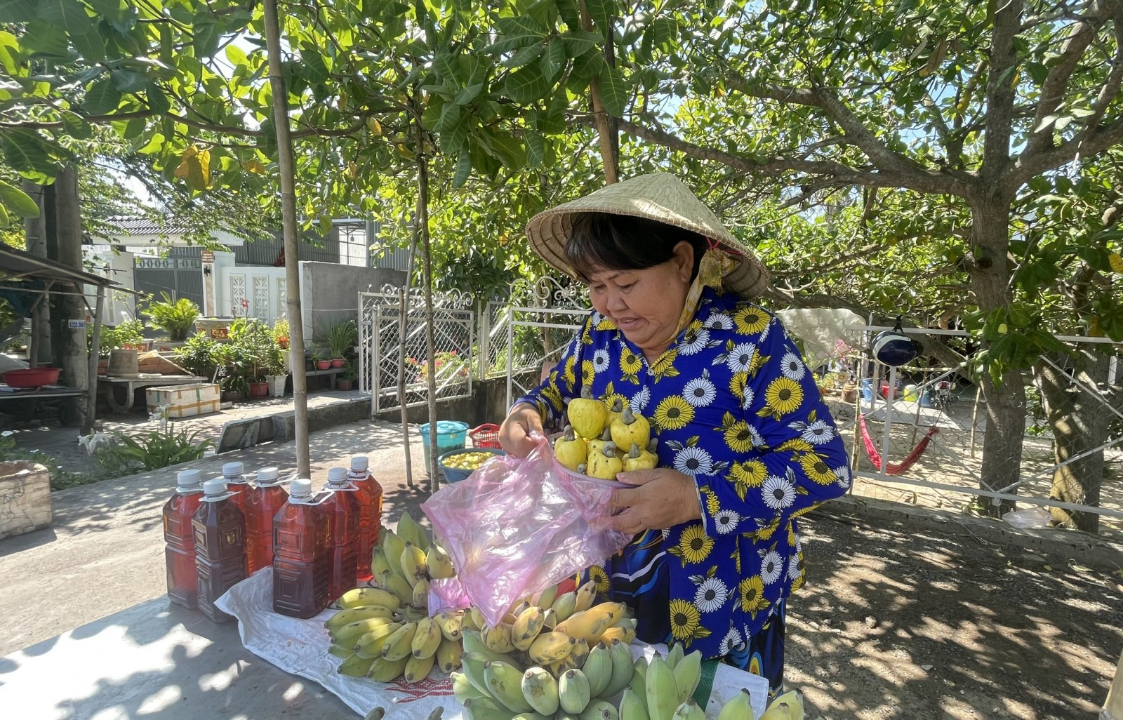 Với mảnh vườn tạp hơn 30.000 m² ngay sau nhà, bà Nghiệp thu hoạch đào quanh năm, rộ nhất vẫn là mùa hè. Mỗi ngày, sạp nhỏ của bà thu về khoảng 300.000 đồng, một con số ý nghĩa từ những cây trái tự nhiên.