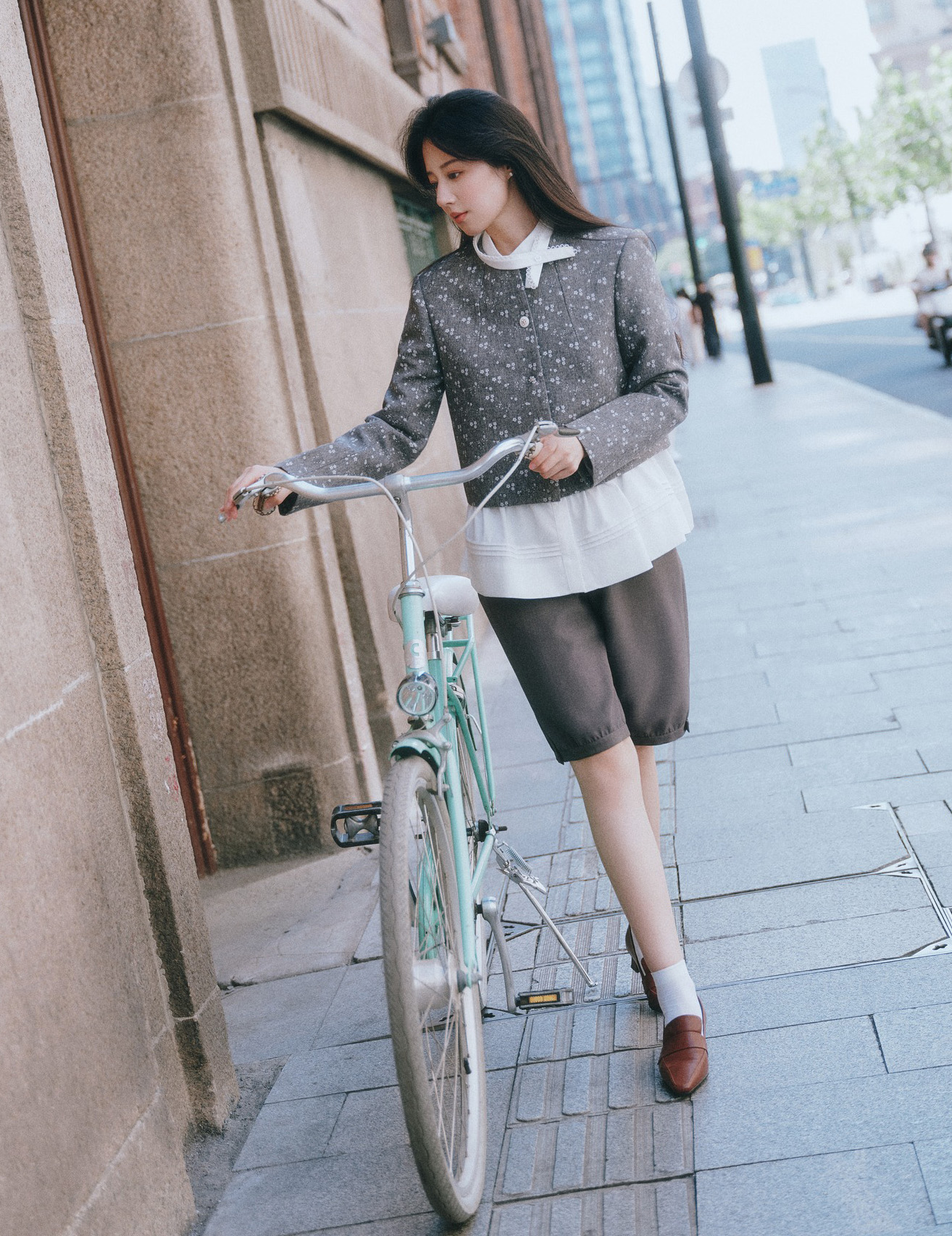 Thêm chiếc áo khoác dáng lửng cho bản phối dạo phố cuối tuần - kết hợp áo babydoll trắng, quần shorts bermuda, giày bệt và tất trắng. Chi tiết cổ áo duyên dáng tạo ấn tượng khó quên cho hình ảnh street wear của quý cô. ẢNH: MAISON LEENAA