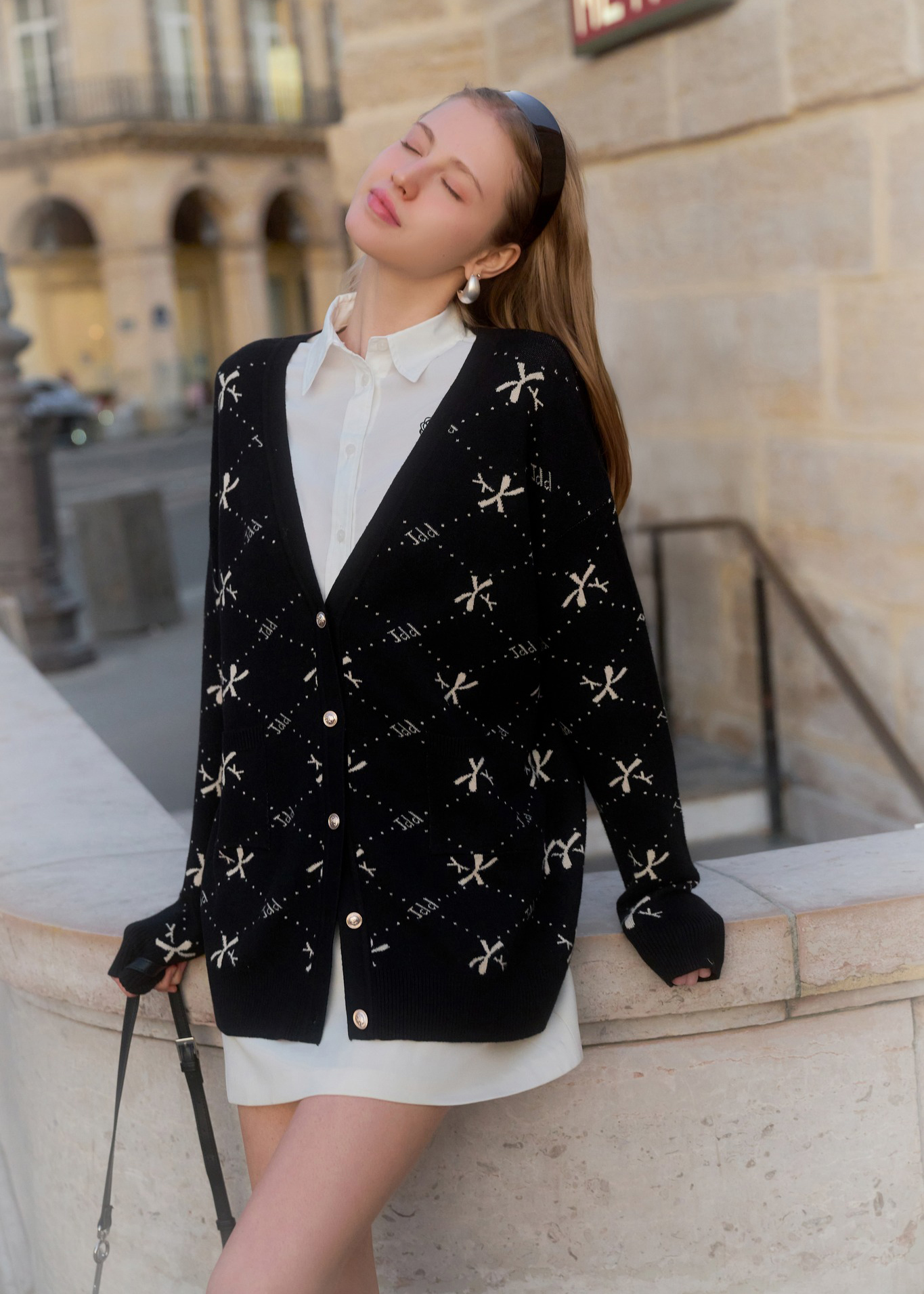 Cardigan dáng dài là một nét phóng khoáng, tự do rất riêng mà nàng nên bổ sung vào tủ đồ mùa lạnh. Thiết kế dệt kim với sự hòa quyện của họa tiết ô quả trám, họa tiết hình nơ mang đến vẻ đáng yêu cho trang phục - phù hợp diện cùng váy mini, quần shorts, các bản phối ngắn trên gối đi cùng giày bốt cổ cao. ẢNH: JM