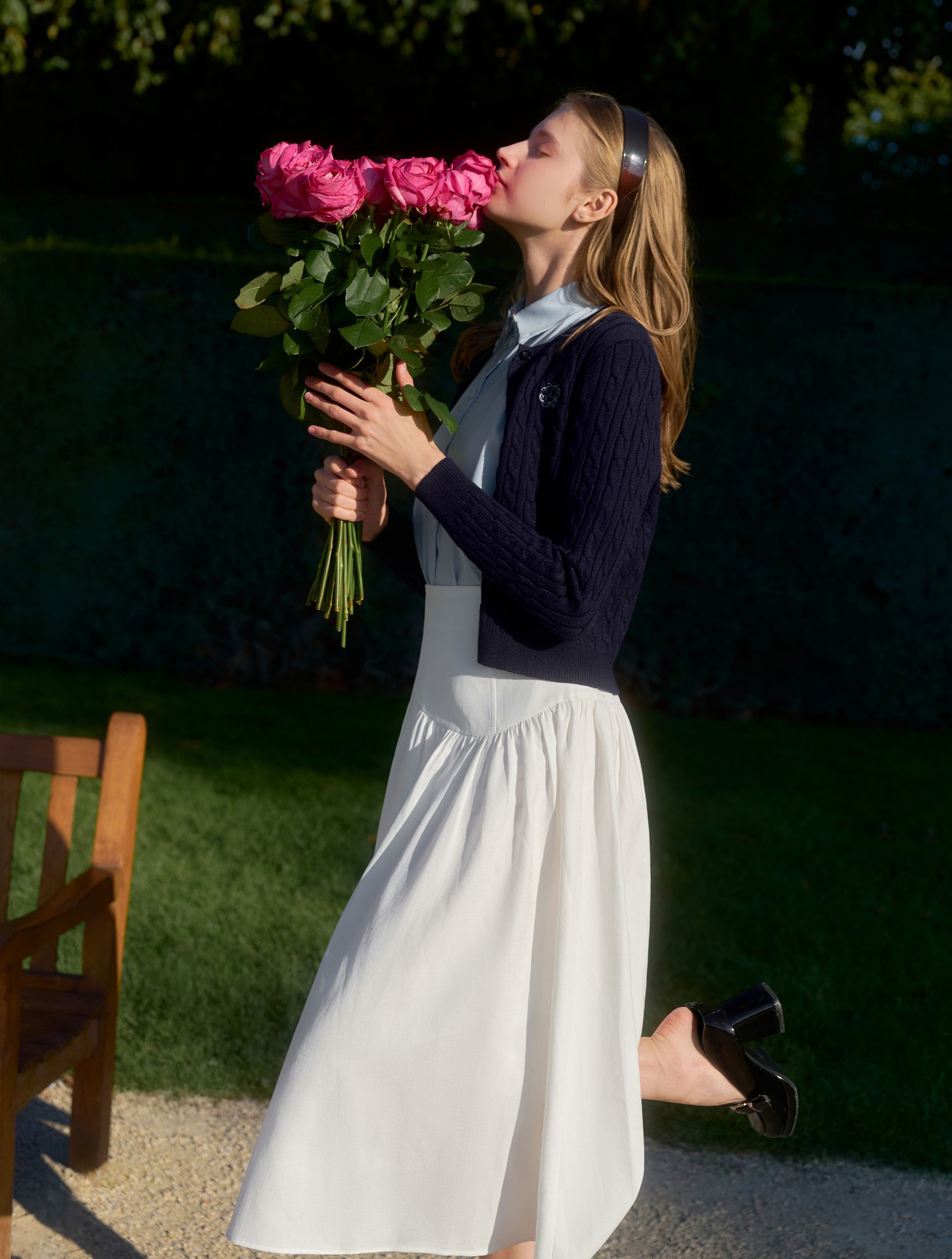 Áo cardigan họa tiết vặn thừng cổ điển, gam màu xanh navy hoàn hảo để diện cùng sơ mi xanh và chân váy trắng midi. ẢNH: JM
