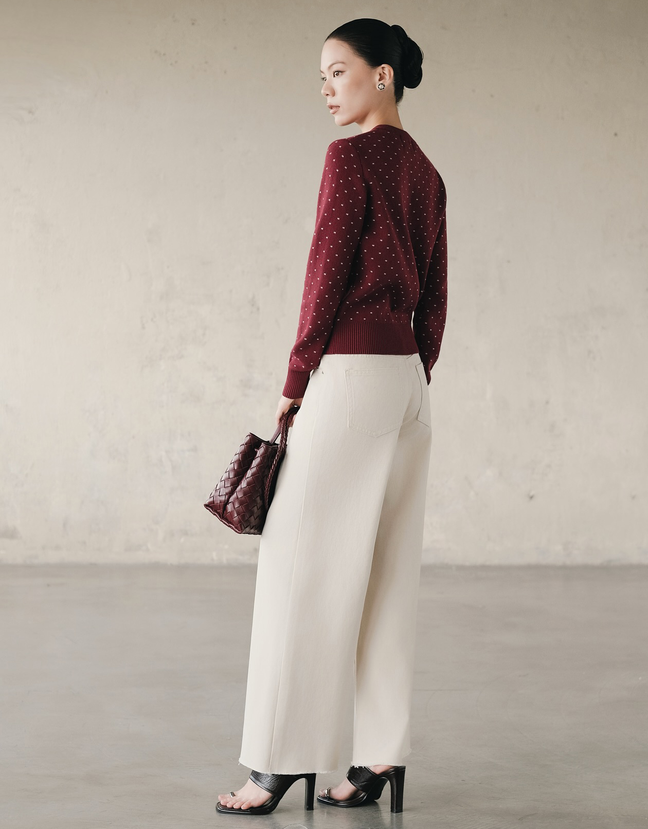 Từ chiếc cardigan màu burgundy trầm ấm, thiết kế kẻ sọc thanh lịch đến gam màu cream điểm từng hạt ngọc trai có kích cỡ khác nhau... tất cả đều mang tinh thần vừa đủ vì không quá cầu kỳ nhưng vẫn khiến người mặc trở nên đặc biệt theo cách riêng. ẢNH: RUBIES