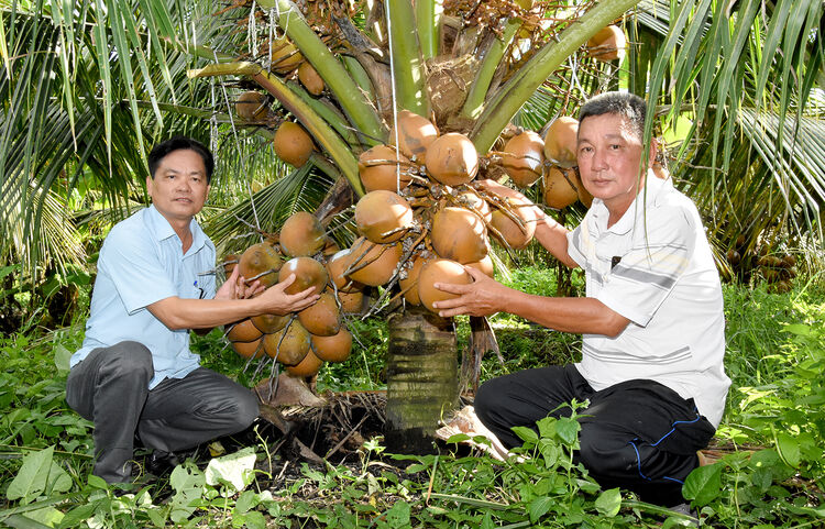 Ông Nhan Văn Tám (bìa phải), ngụ ấp Tân Thành, xã Tân Hội cùng Phó Chủ tịch Hội Nông dân xã Tân Hội Đặng Phước Vũ (bìa trái) trao đổi kỹ thuật trồng dừa xiêm đỏ Mã Lai. Ảnh: KIỀU DIỄM