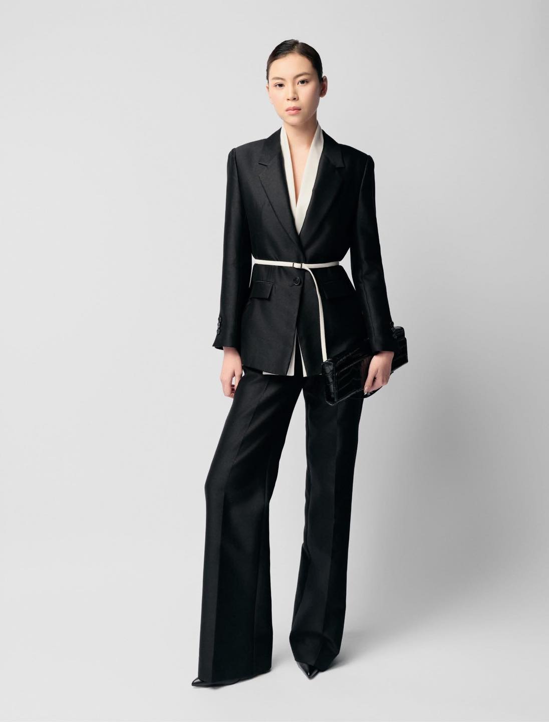 Tận dụng tối đa lợi thế tôn dáng của kiểu trang phục may đo tối giản, sang trọng và tinh tế, bản phối còn mở ra một hướng đi mới khi tạo ra điểm nhấn nơi eo tương đồng - dây lưng trắng bản nhỏ phối cùng áo/khăn lụa trắng tạo nên đường viền dọc theo cổ và nẹp áo. ẢNH: WHITE ANT