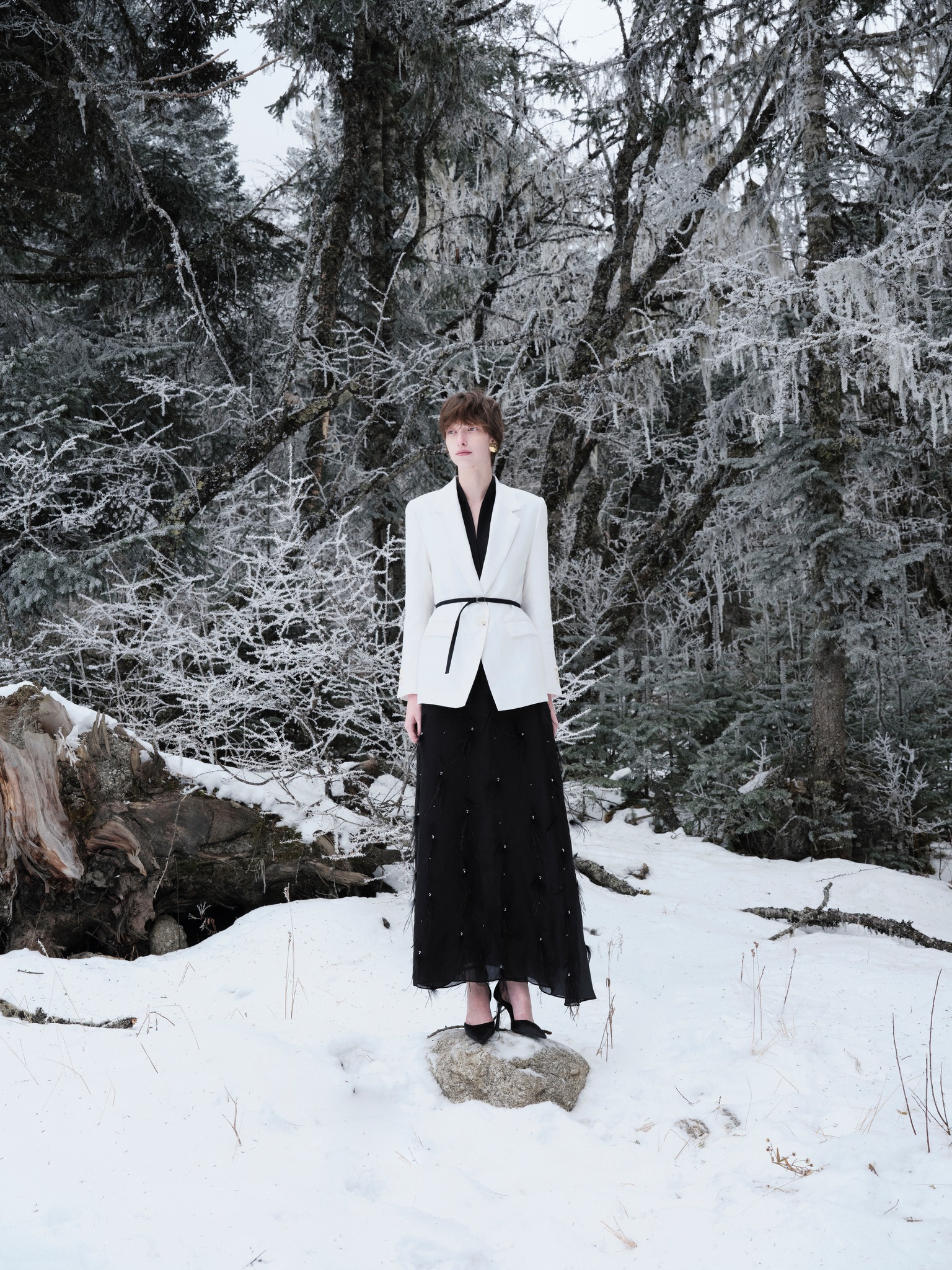 Hai gam màu trắng đen được đổi chỗ cho nhau theo cách thật tinh tế và khéo léo. Chân váy organzar đính chi tiết lông vũ đồng điệu cùng giày cao gót, khăn lụa và dây lưng tông đen. ẢNH: WHITE ANT