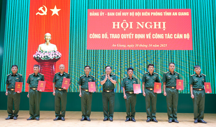 Đại tá Nguyễn Văn Hiệp, Phó Chính ủy Bộ Chỉ huy Quân sự, Chính ủy Ban Chỉ huy Bộ đội Biên phòng tỉnh An Giang trao quyết định cho cán bộ.
