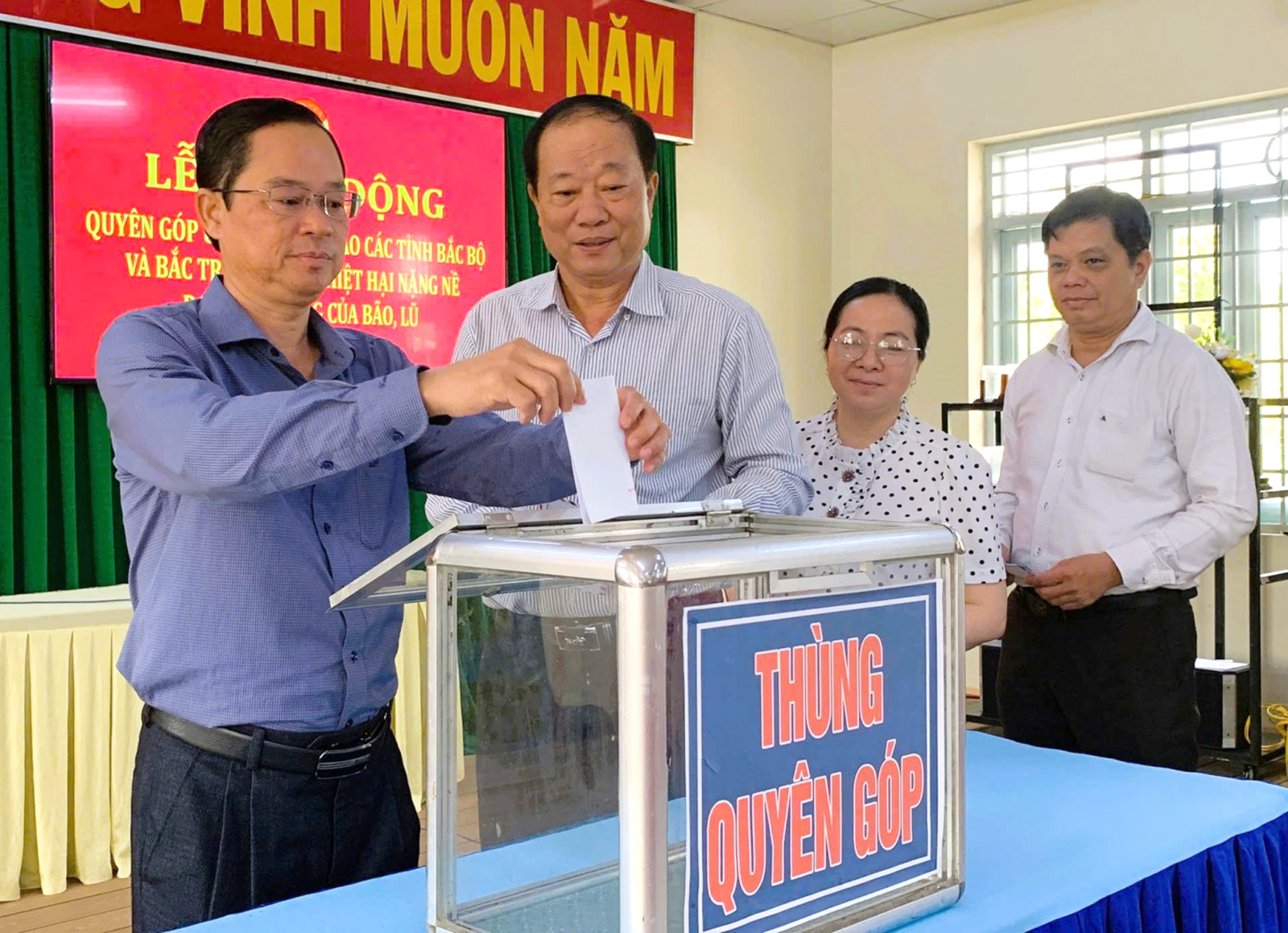Lãnh đạo xã Phú Hòa ủng hộ đồng bào bị thiệt hại do bão lũ.