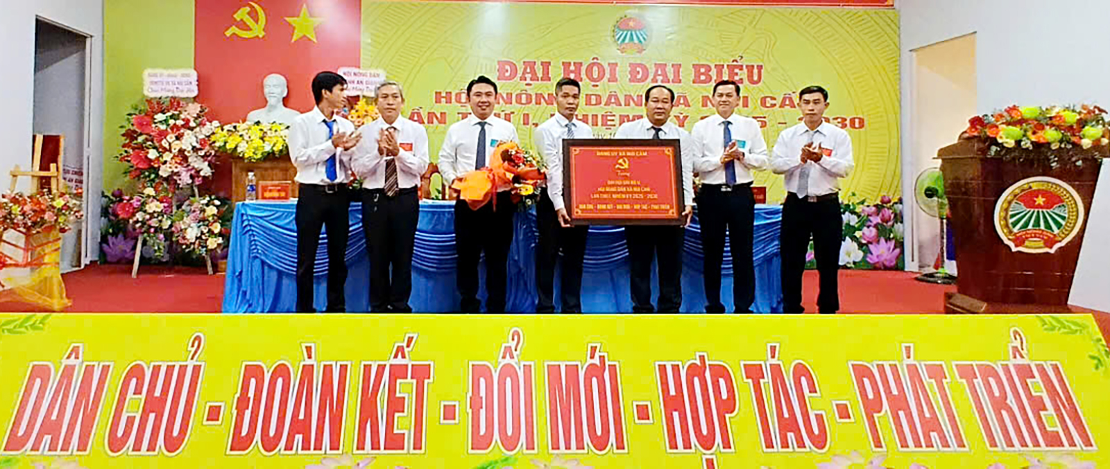 Đảng ủy xã Núi Cấm tặng bức trướng chúc mừng Đại hội đại biểu Hội Nông dân xã.