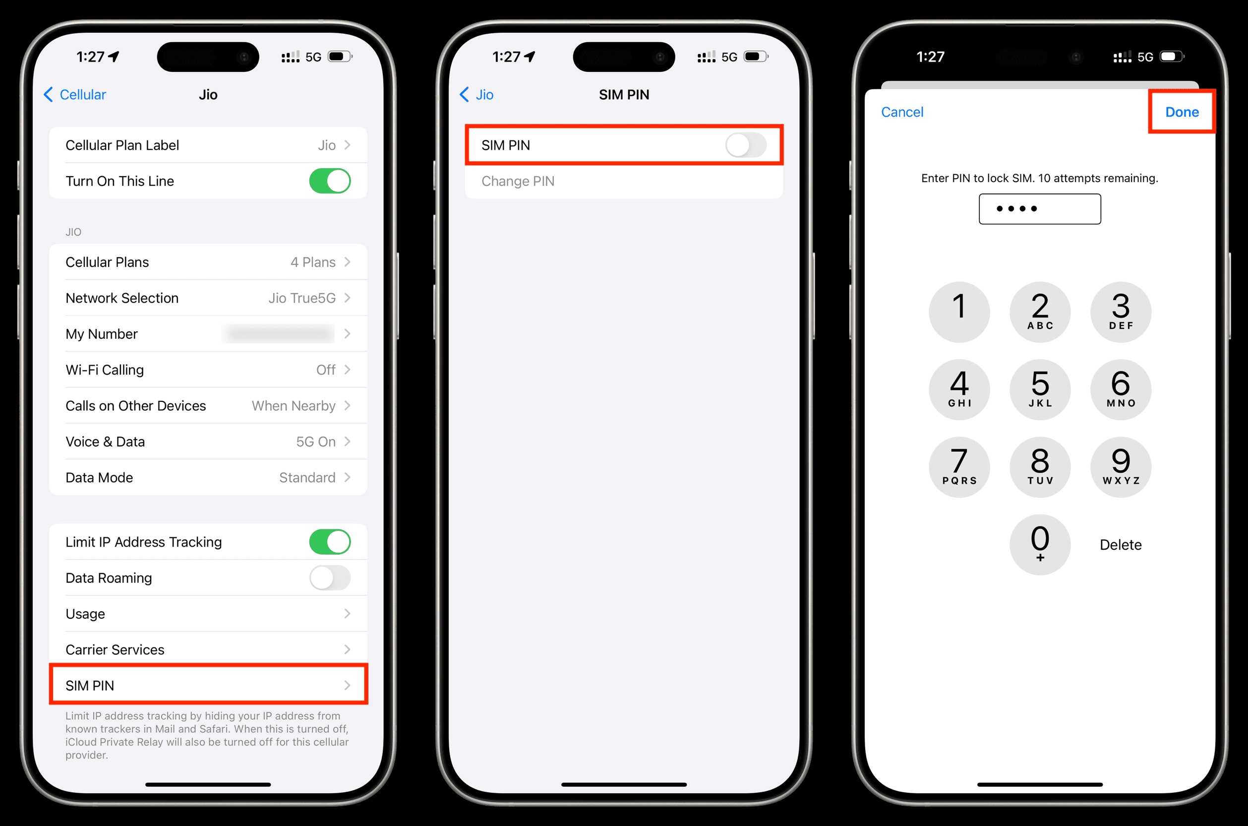 Trên iPhone: Vào Cài đặt (Settings) > Di động (Cellular) > chọn vào tên nhà mạng đang sử dụng dưới mục SIMs > cuộn xuống cuối giao diện chọn vào PIN của SIM (SIM PIN) để tiến hành thiết lập.