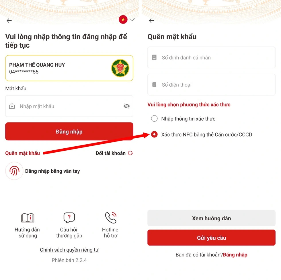 Yêu cầu cấp lại mật khẩu VNeID bằng cách quét thẻ Căn cước công dân có gắn chip