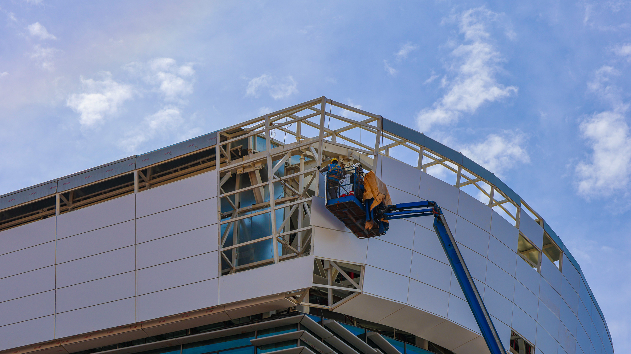 Các công nhân đang hoàn thiện phần mái một cánh nhà ga hành khách sân bay Long Thành. ẢNH: LÊ LÂM