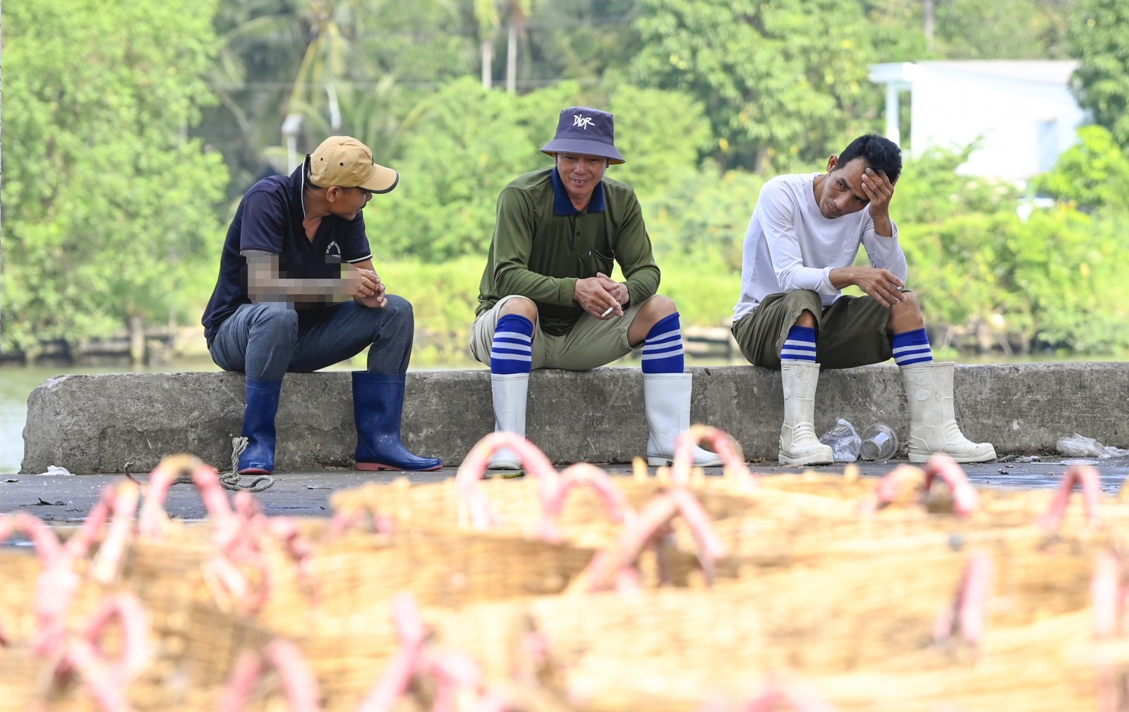 Do lượng hải sản vào cảng cá Tắc Cậu ít nên công nhân bốc xếp rảnh tay ngồi tán gẫu. Ảnh: PHẠM HIẾU