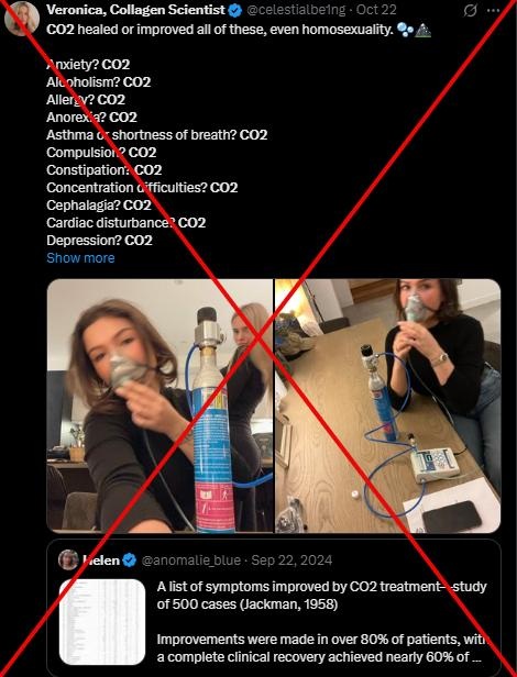 Gần đây một bài đăng trên X có nội dung: "CO₂ chữa lành hoặc cải thiện những tình trạng này, thậm chí là đồng tính luyến ái", kèm ảnh một người đang hít thở qua mặt nạ có nối ống vào một bình khí.