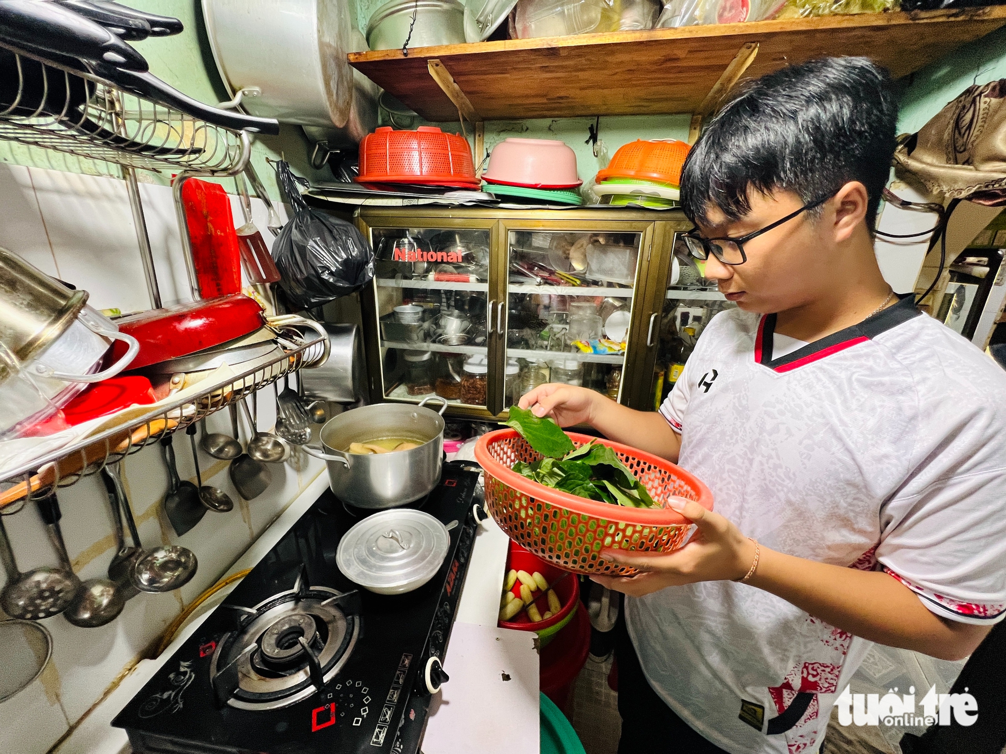 Ngoài giờ học, Nguyễn Hữu Thọ phụ giúp công việc nhà cho ông bà đỡ vất vả. Từ nấu cơm, quét nhà, dọn dẹp, Thọ đều đỡ đần ông bà - Ảnh: YẾN TRINH