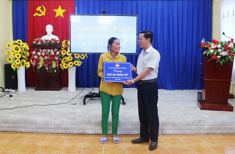 Đại diện Công ty TNHH Đại Phước - Bình Dương trao 60 triệu đồng để cất nhà Đại đoàn kết cho gia đình bà Huỳnh Ngọc Cà, ngụ ấp Hòa Lợi 1. Căn nhà sẽ được xây dựng với diện tích 40m2, kết cấu nhà sàn, mái tole, vách tole, đảm bảo tiêu chí “3 cứng”.