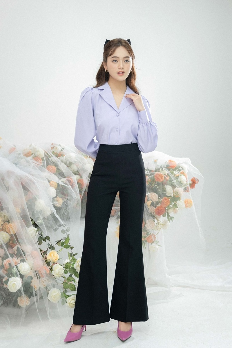 Nếu tweed đại diện cho sự cổ điển sang trọng, thì áo sơ mi lại mang đến vẻ đẹp tối giản nhưng đầy tinh tế. Chiếc quần ống loe đen giữ vai trò nền tảng trong bản phối với áo sơ mi tím tay bồng thời thượng. Thiết kế tay áo phồng nhẹ giúp cân bằng thị giác với phần ống loe phía dưới, tạo nên tỷ lệ cơ thể hình đồng hồ cát mềm mại. ẢNH: @JMDRESSDESIGN