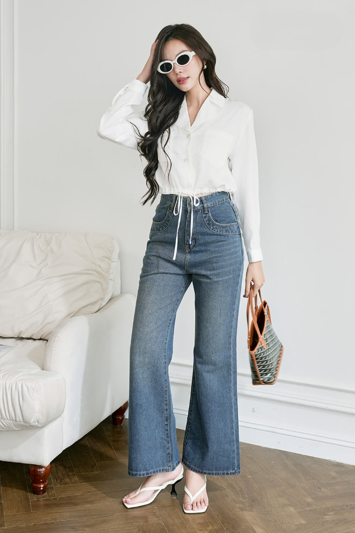 Không có gì tôn dáng hơn một chiếc quần denim ống loe xanh cạp cao phối cùng áo sơ mi trắng. Chỉ cần thêm một chiếc kính mát viền trắng, hoàn thiện vẻ ngoài cá tính khi xuống phố. ẢNH: GUMAC