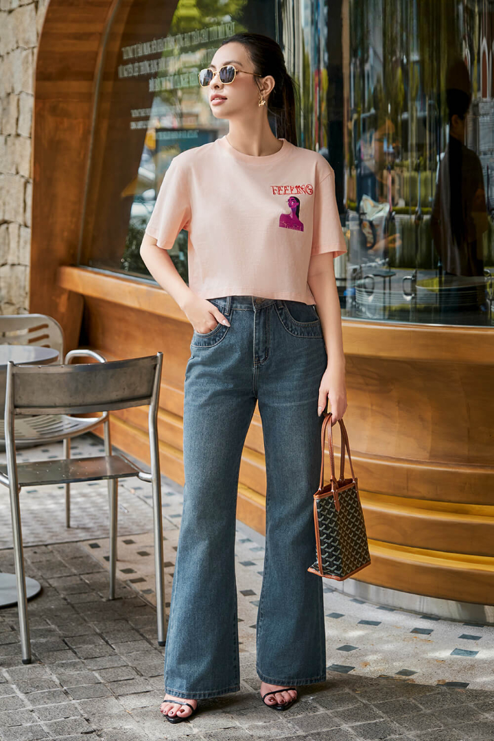 Quần denim ống loe xanh trung tính với phần hông và đùi ôm vừa vặn giúp tạo cảm giác gọn gàng nhưng vẫn đảm bảo sự thoải mái khi di chuyển. Phần ống loe nhẹ từ bắp chân kết hợp cùng áo phông hồng pastel có họa tiết trẻ trung trước ngực, tổng thể trang phục trở nên tươi sáng và giàu sức sống. ẢNH: GUMAC