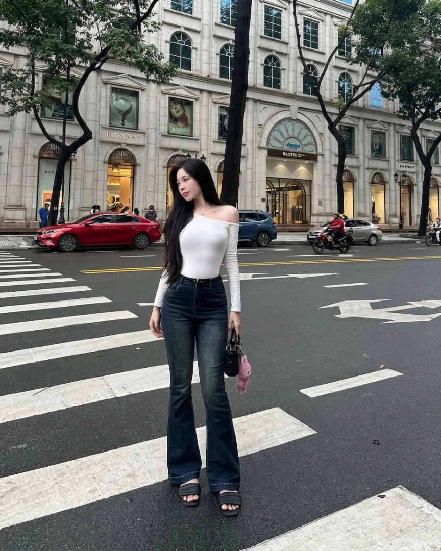 Quần denim ống loe xanh đậm kết hợp cùng áo trễ vai trắng tay dài, phần vai được khoe khéo léo trong khi tay áo dài giữ lại nét trang nhã cần thiết, tạo nên hình ảnh nữ tính, phù hợp cho những buổi dạo phố hoặc gặp gỡ thân mật. ẢNH: @PRINCESSCLOSET_BYHNHEY