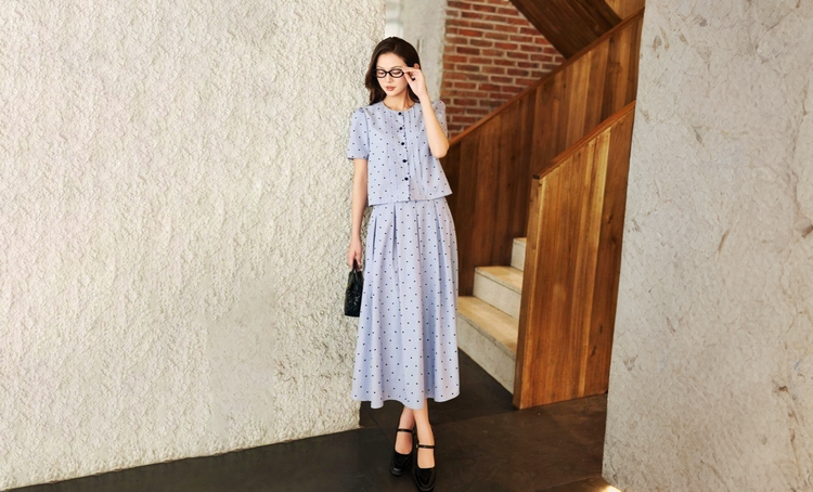Set đồng bộ thoáng mát và có khả năng "hack" dáng tốt nhờ kết cấu áo crop và chân váy dài dáng xòe. Họa tiết chấm nhỏ trên nền xanh như mang đến cho nàng những cơn gió mát lành từ biển khơi xanh thẳm. ẢNH: OYSTER