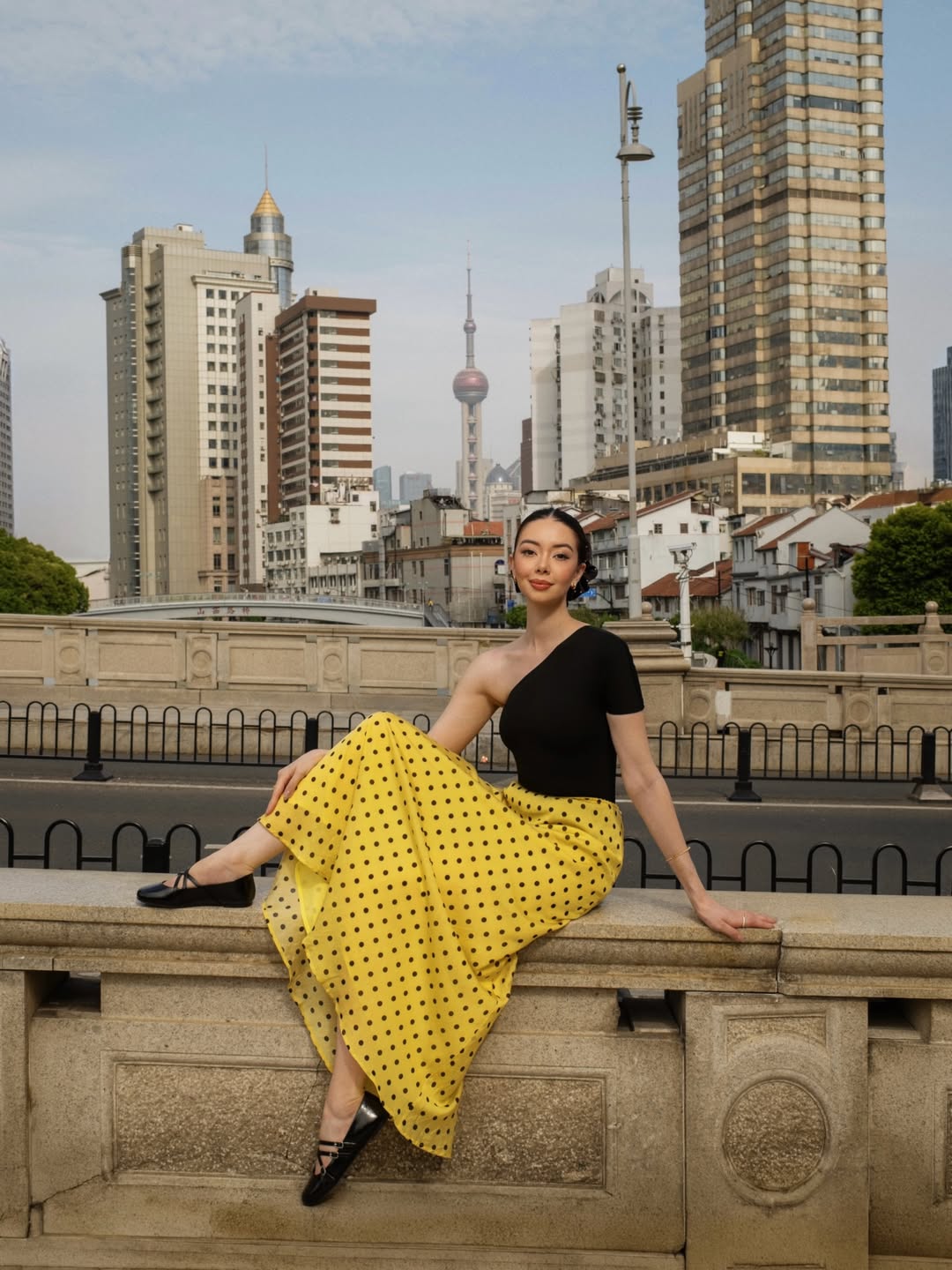Cặp đôi màu sắc vàng và đen càng trở nên nổi bật hơn qua sự tương phản từ những họa tiết chấm bi trên chân váy. Cặp đôi áo lệch vai, chân váy dài và giày Mary Jane đế bệt phản ánh hình ảnh thanh lịch, tinh giản nhưng có thể thu hút mọi sự chú ý của quý cô thành thị. ẢNH: @TARA WHITEMAN