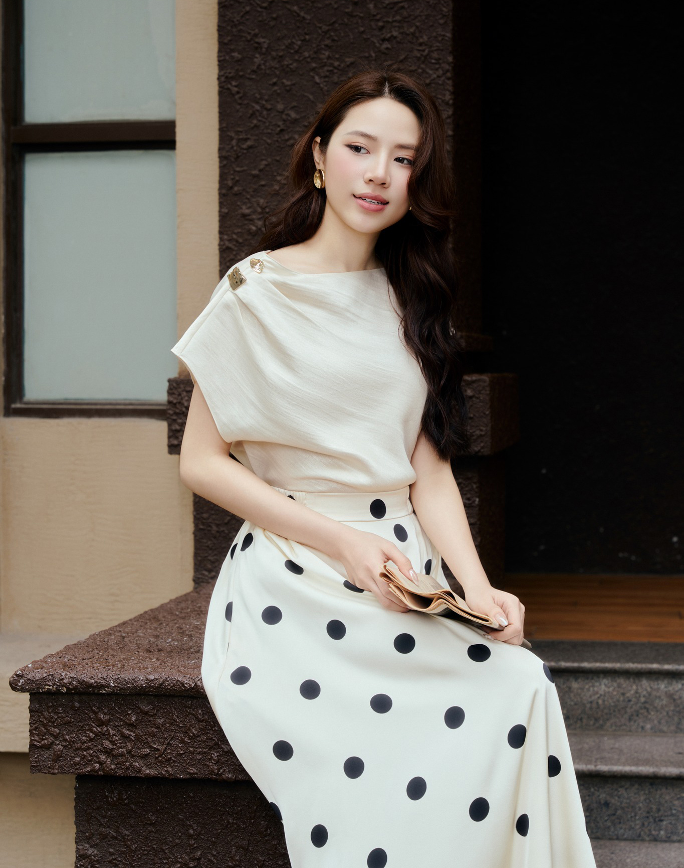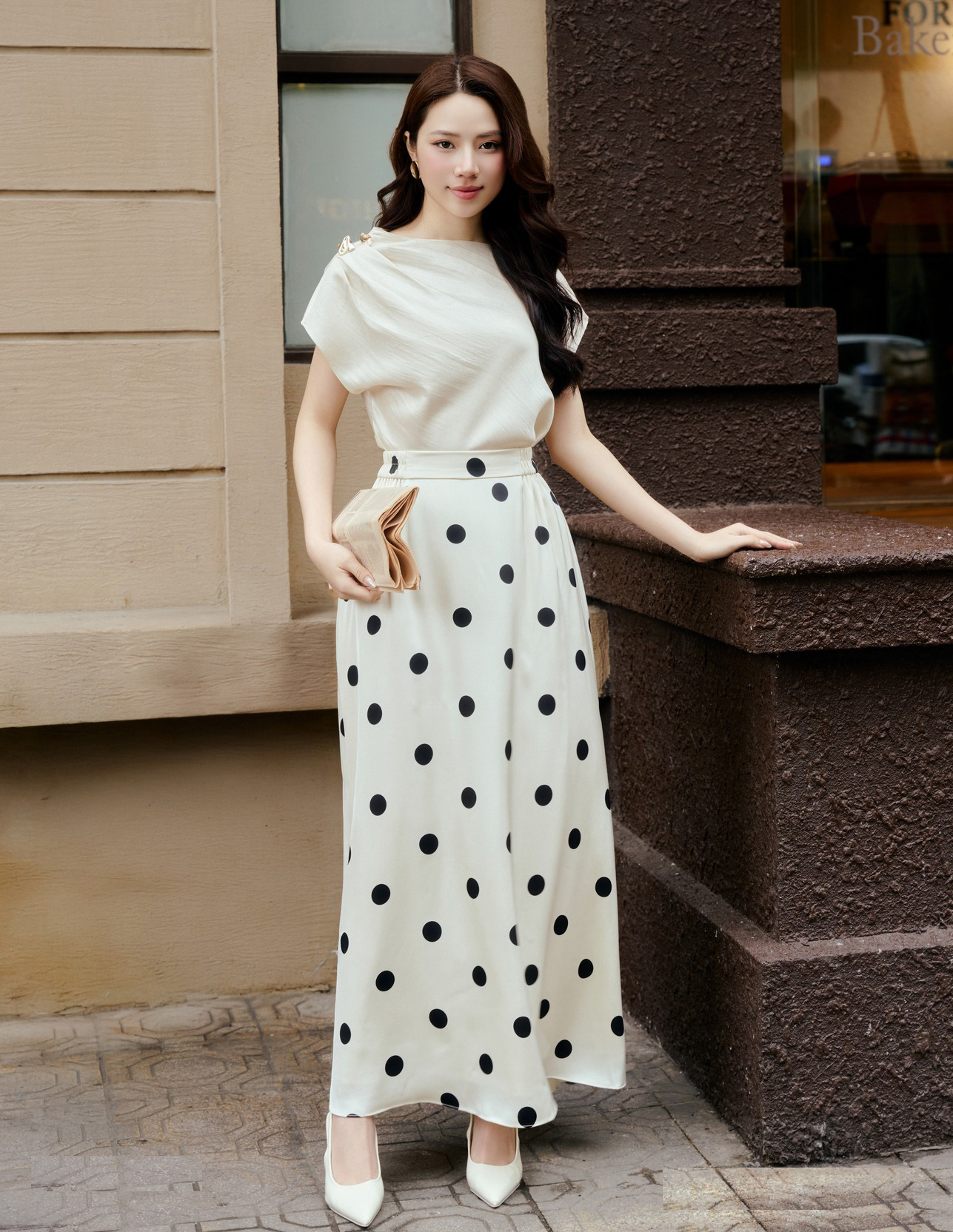 Phong cách hè của nàng trở nên nổi bật hơn khi diện chân váy chấm bi và áo tơ cách điệu có phần vai lệch. Cặp đôi sáng màu tôn trọn vẻ trẻ trung tươi mới, mang lại dáng vẻ ngọt ngào và mát mẻ trong những ngày nắng. ẢNH: PANTIO