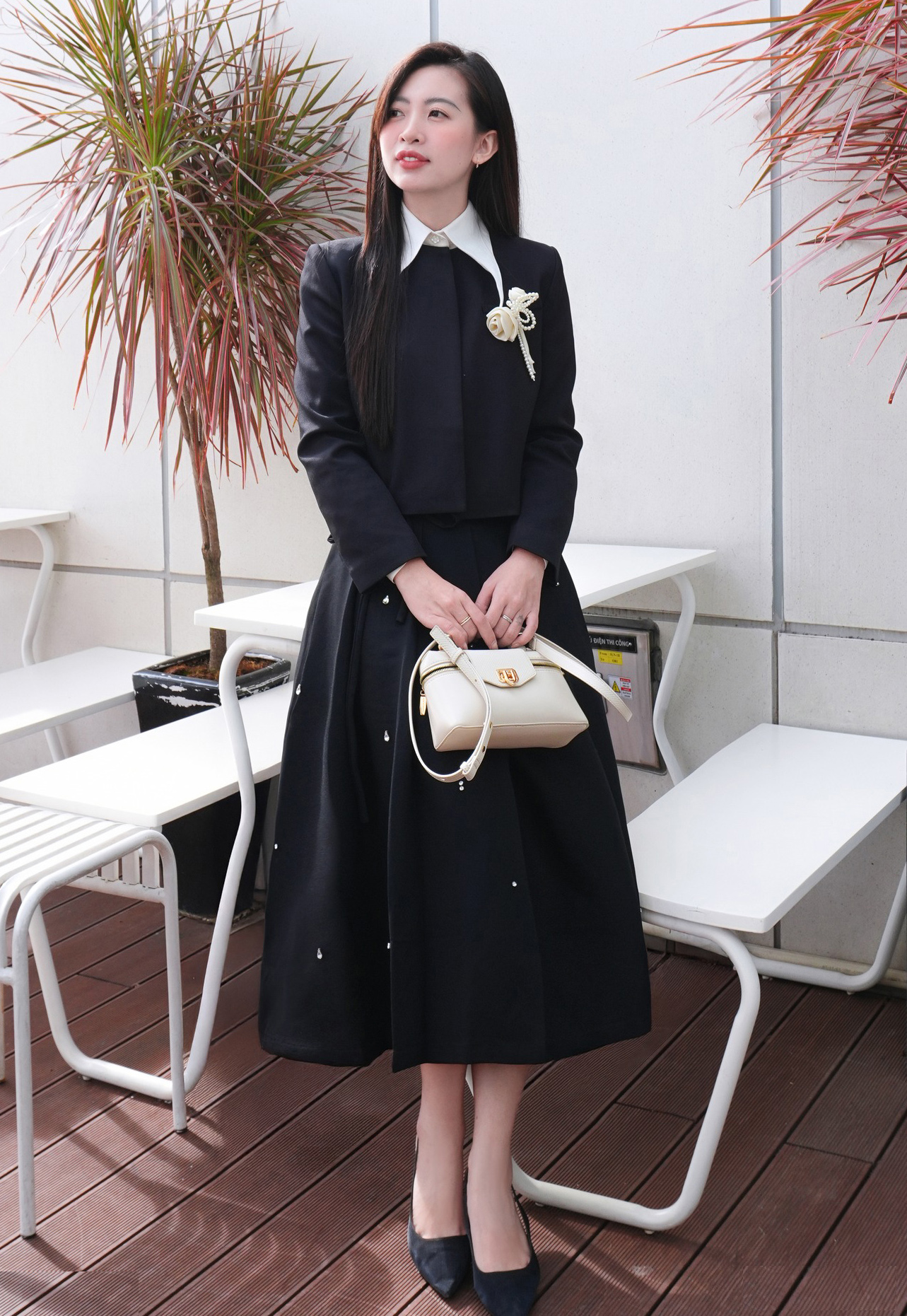 Áo blazer đứng phom kết hợp chân váy xếp ly và sơ mi trắng cổ nhọn tạo nên diện mạo chỉn chu và cuốn hút phù hợp cả khi đi làm và đi chơi. Chi tiết hoa cài trên áo, họa tiết đính kết rải rác trên chân váy hay phần cổ trắng tạo nên các điểm nhấn tinh tế cho bản phối. ẢNH: BOHEE