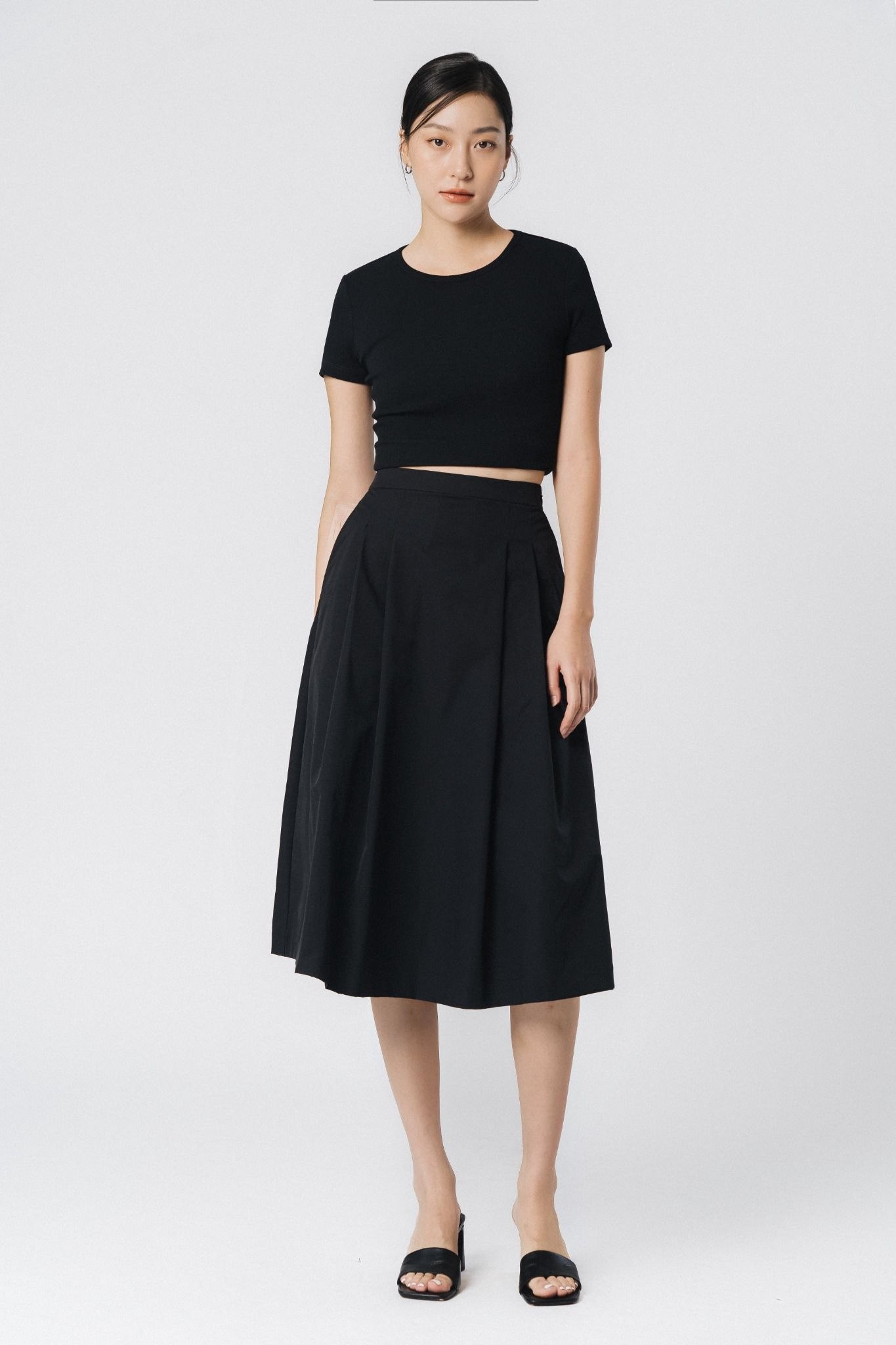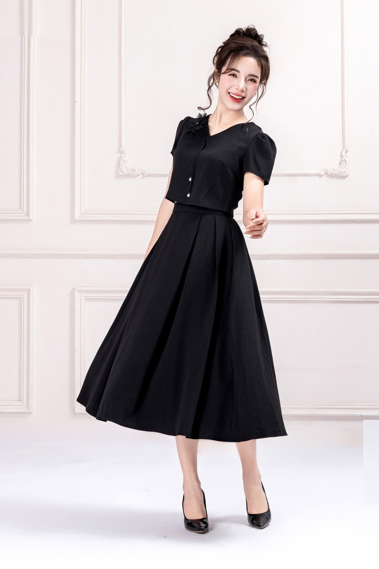Chân váy midi xòe đen bay bổng, hòa quyện nét cổ điển và hiện đại, giúp nàng tự tin hơn. ẢNH: G9 MOZA