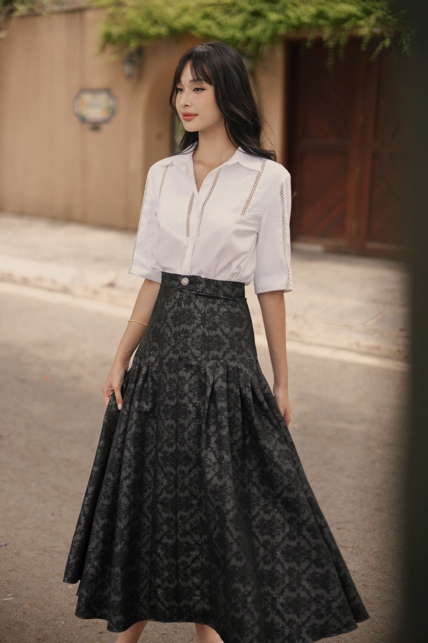Chân váy midi đen tối giản, kết hợp cùng áo cổ bẻ nhẹ nhàng mang đến vẻ thanh thoát. ẢNH: NEM FASHION