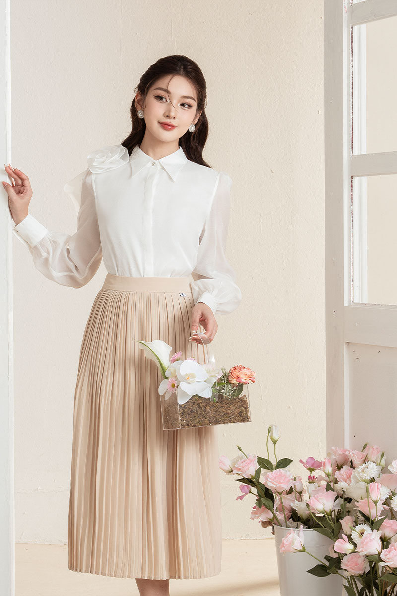 Chân váy xếp ly dài qua gối màu be nhạt, phom rũ nhẹ tạo chuyển động uyển chuyển khi bước đi, mang đến vẻ ngoài dịu dàng và thướt tha. Màu be trung tính giúp tôn da phối cùng áo sơ mi trắng tinh khôi cho tổng thể nữ tính và lãng mạn.