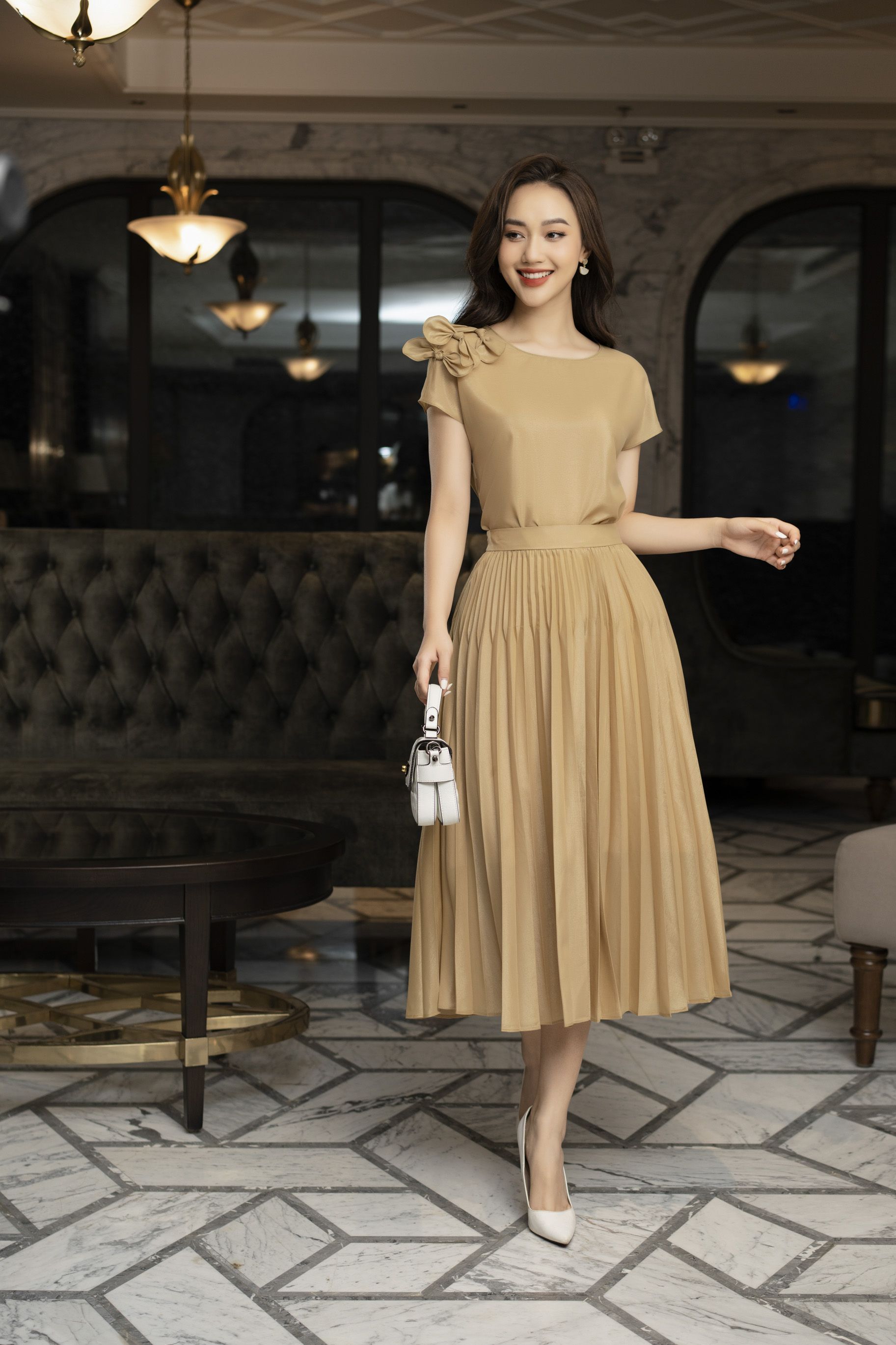Ở set đồ này, nàng chọn bộ trang phục đồng màu camel, gồm chân váy xếp ly dài qua gối với độ bồng nhẹ tạo độ phồng tự nhiên. Chiếc váy được phối cùng áo sơ vin với hoa 3D ở vai, tạo hiệu ứng “liền mạch” sang trọng, giúp cơ thể trông thon gọn và cao ráo hơn.