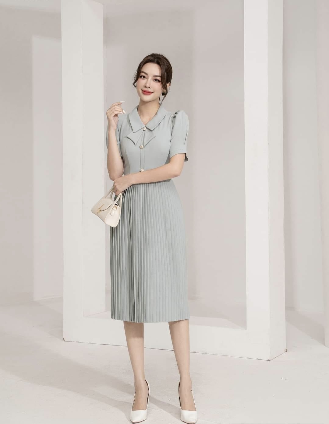 Khi kết hợp cùng thiết kế xếp ly, vẻ ngoài của nàng càng thêm mềm mại mà vẫn nổi bật theo cách rất riêng. Diện một set đồ xanh xám dịu mắt, trong đó chân váy xếp ly dài ngang bắp chân giúp “kéo dài” đôi chân và làm tổng thể trở nên nhẹ nhàng hơn.