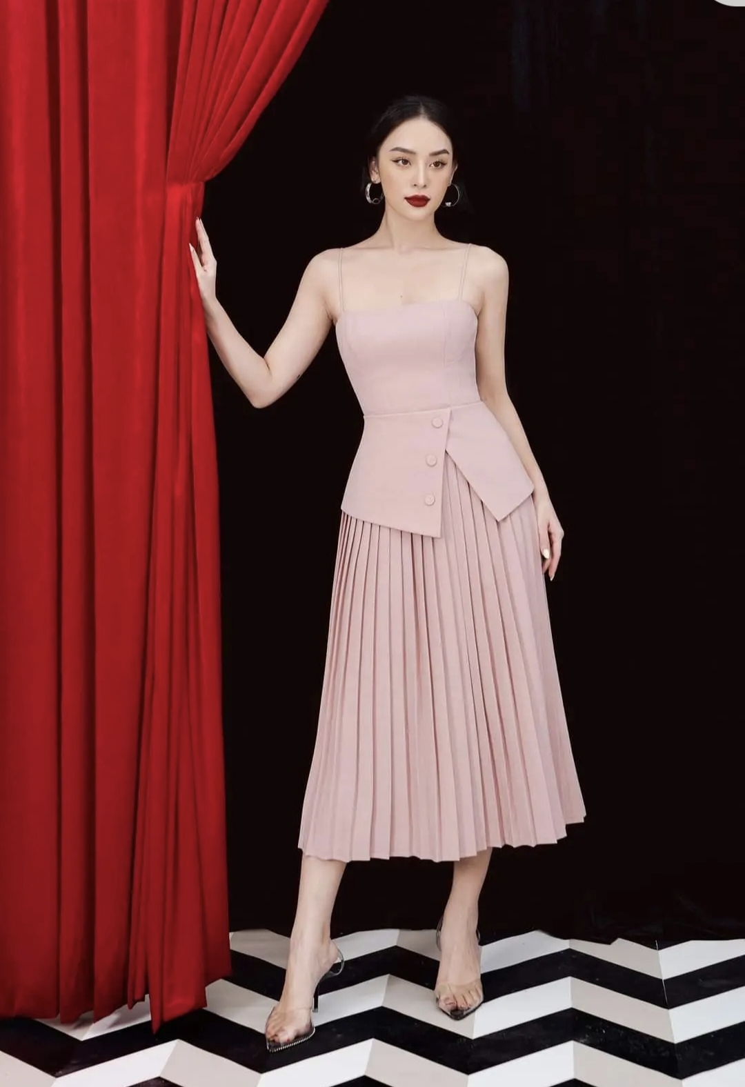 Diện chân váy xếp ly xòe nhẹ dài ngang bắp chân với tông hồng phấn ngọt ngào, tôn lên vẻ nữ tính nổi bật. Phần phối đồ trở nên thời thượng hơn nhờ chiếc áo hai dây dáng peplum lệch vạt, được đính cúc tạo hiệu ứng điểm nhấn tinh tế ở eo giúp vóc dáng thon gọn và mềm mại.