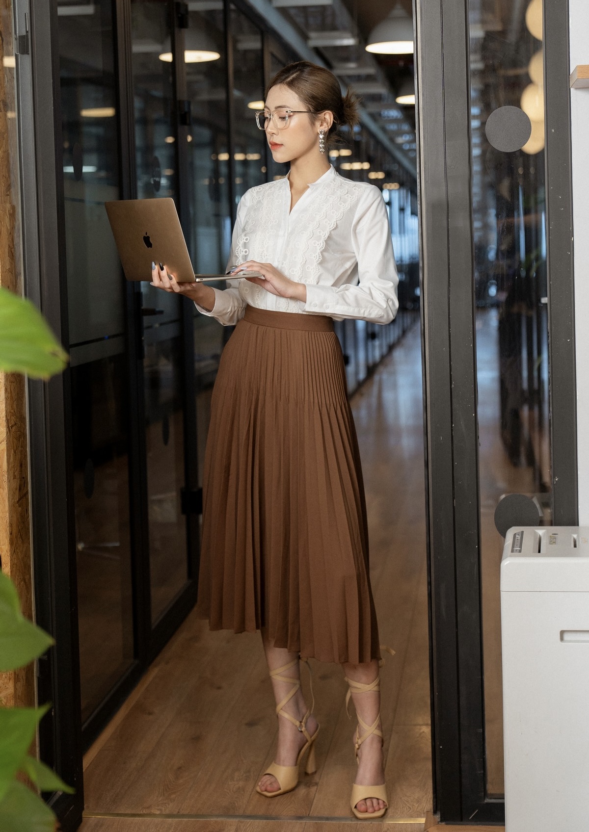 Chân váy xếp ly dài qua gối màu nâu đất mang đến vẻ cổ điển nhưng đầy thanh lịch. Màu nâu trầm ấm giúp tổng thể trở nên sang hơn và tạo cảm giác vóc dáng thon gọn, phối cùng áo sơ mi trắng dài tay, nổi bật với chi tiết ren thêu tinh tế ở cổ và ngực tạo điểm nhấn nhẹ nhàng nhưng đầy tinh xảo.