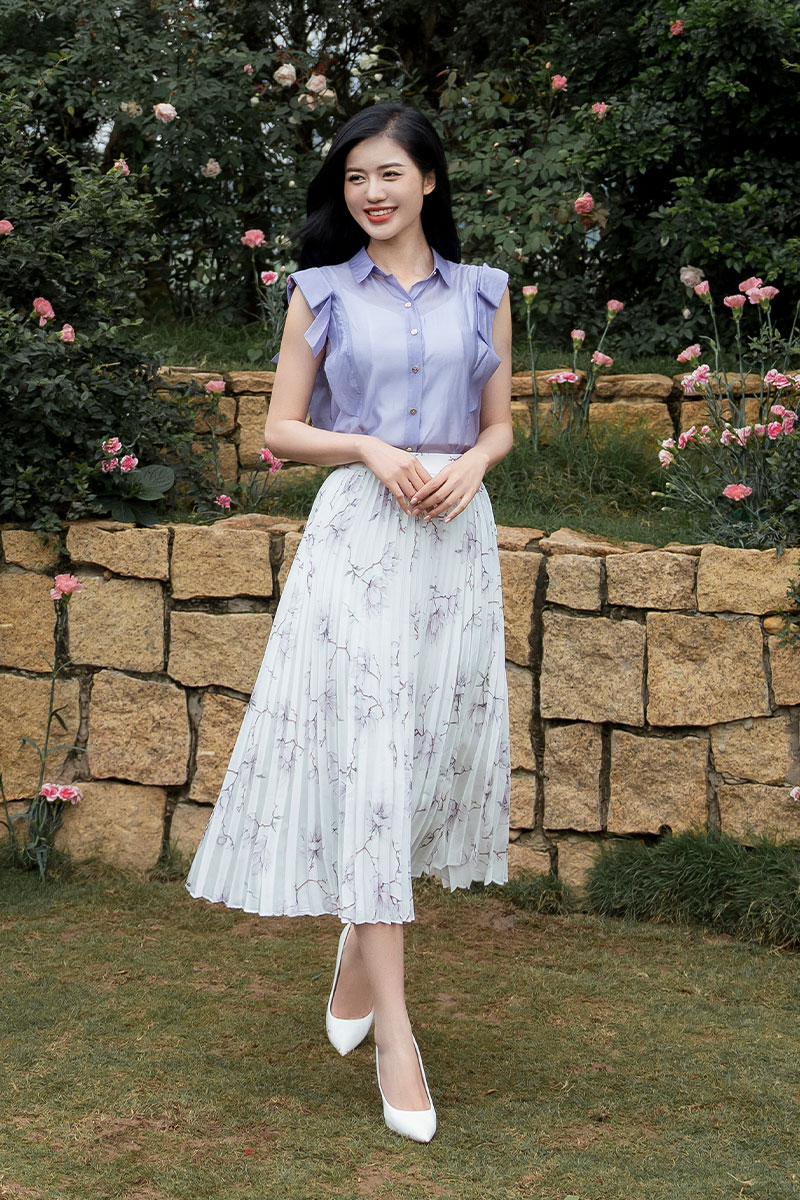 Lựa chọn chân váy xếp ly midi màu trắng kem với họa tiết cành hoa tím nhạt, mang lại cảm giác mềm mại. Phối cùng áo sơ mi sát nách màu tím nhạt, điểm thêm bèo nhún vai để tăng sự điệu đà và nữ tính.