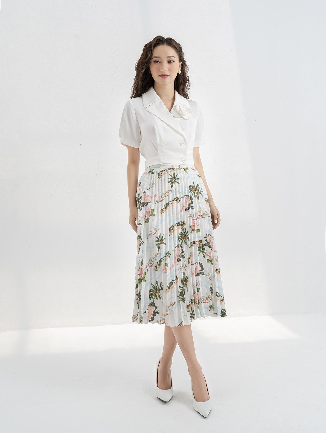 Chân váy xếp ly midi màu trắng điểm họa tiết cây cọ và hoa pastel, tạo cảm giác tươi mới, năng động và rất hợp không khí mùa hè. Phối với áo crop top trắng dáng vest cộc tay, có hoa 3D ở cổ áo, khiến tổng thể vừa hiện đại vừa thanh lịch.