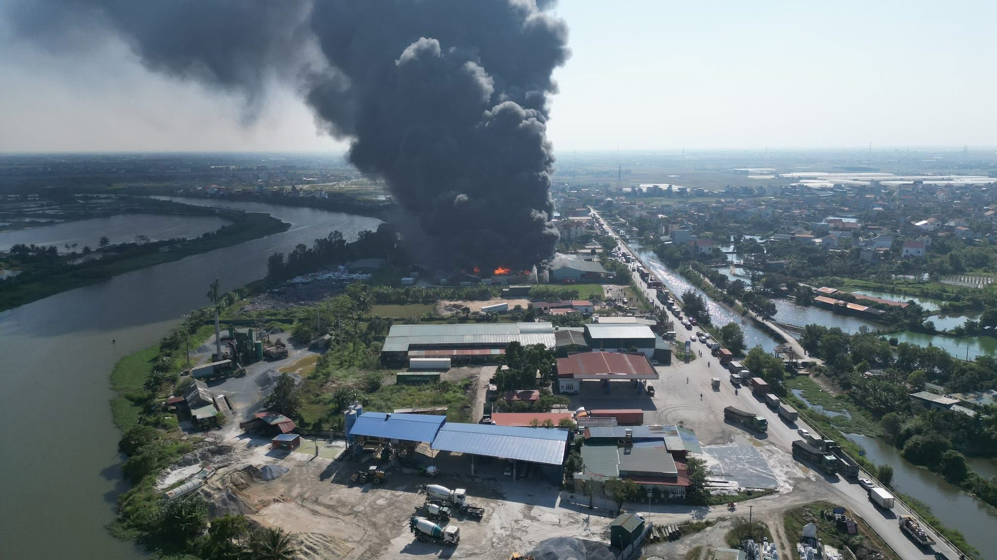 Một xưởng sản xuất dép nhựa tại xã Trường Tân, TP.Hải Phòng, bất ngờ bốc cháy dữ dội, tạo cột khói đen cao hàng chục mét, bao trùm cả khu vực, khiến người dân hoảng hốt.