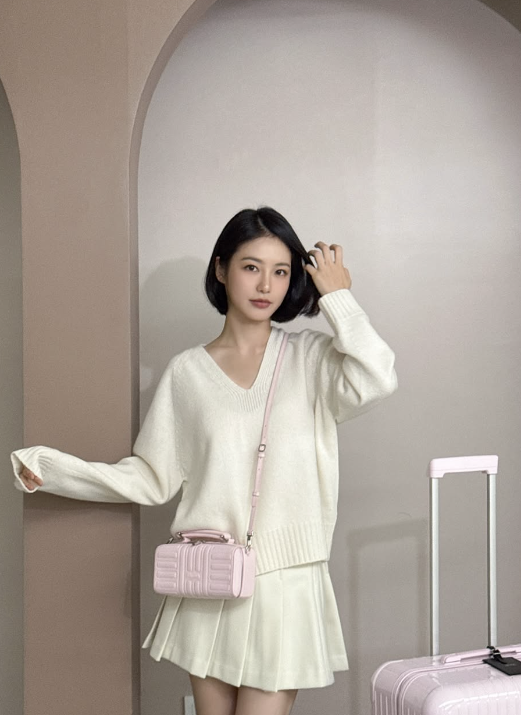 Áo len dệt kim cổ chữ V với phom dáng suông thoải mái cùng chân váy xếp ly ngắn giúp tôn lên nét nữ tính và năng động. Điểm nhấn nhẹ nhàng đến từ chiếc túi hồng pastel làm tổng thể thêm phần ngọt ngào và trẻ trung. Với hiệu ứng đơn sắc, trang phục không chỉ giúp vóc dáng thêm thanh thoát mà còn thể hiện gu thẩm mỹ tinh tế, dễ ứng dụng trong nhiều dịp khác nhau.