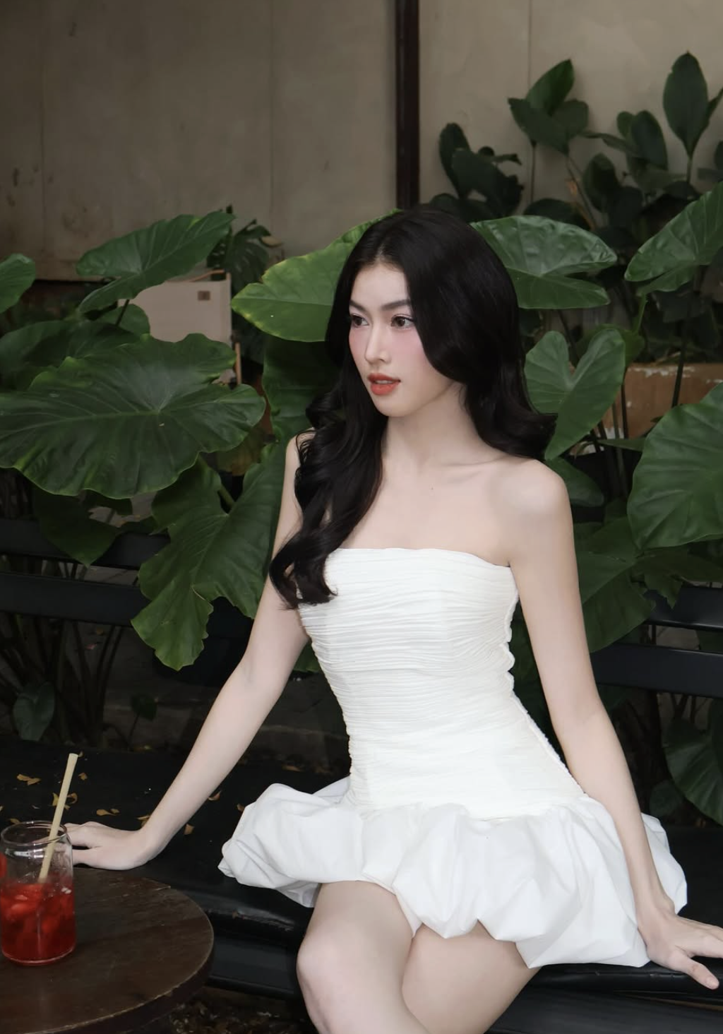 Chiếc váy trắng cúp ngực mang đến vẻ tinh khôi và nữ tính cho nàng. Thiết kế không dây khoe bờ vai và xương quai xanh, phần thân trên nhún bèo ôm nhẹ cơ thể tạo điểm nhấn duyên dáng, trong khi chân váy xòe bồng xếp lớp giúp tổng thể trở nên nhẹ nhàng, bay bổng. ẢNH: @NGUYENLENGOCTHAO297