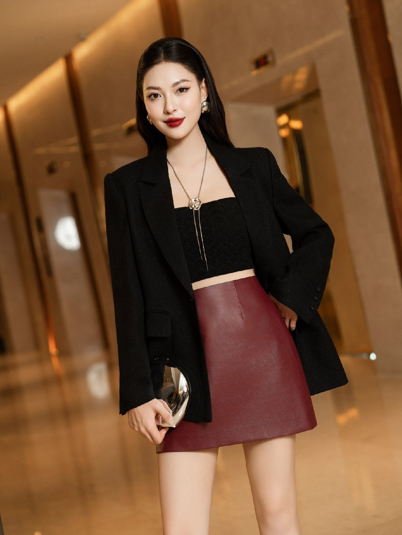 Có thể thấy rõ sức ảnh hưởng và tính ứng dụng đa dạng của kiểu áo khoác quen thuộc. Blazer cropped mặc cùng chân váy dài thành bản phối đồng bộ, blazer đen mang lại vẻ chững chạc, chuyên nghiệp cho các bộ trang phục công sở, văn phòng.ẢNH: HERADG