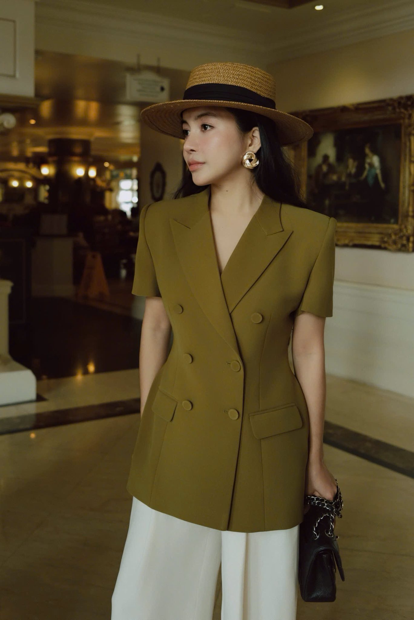 Blazer ngắn tay màu xanh ô liu có thiết kế hai hàng cúc cổ điển, phom dáng vừa vặn và thoải mái diện cùng quần ống rộng cạp cao khắc họa rõ nét hình ảnh tối giản thanh lịch để nàng đi làm, đi họp và cho mọi nhu cầu. ẢNH: THE SOUL