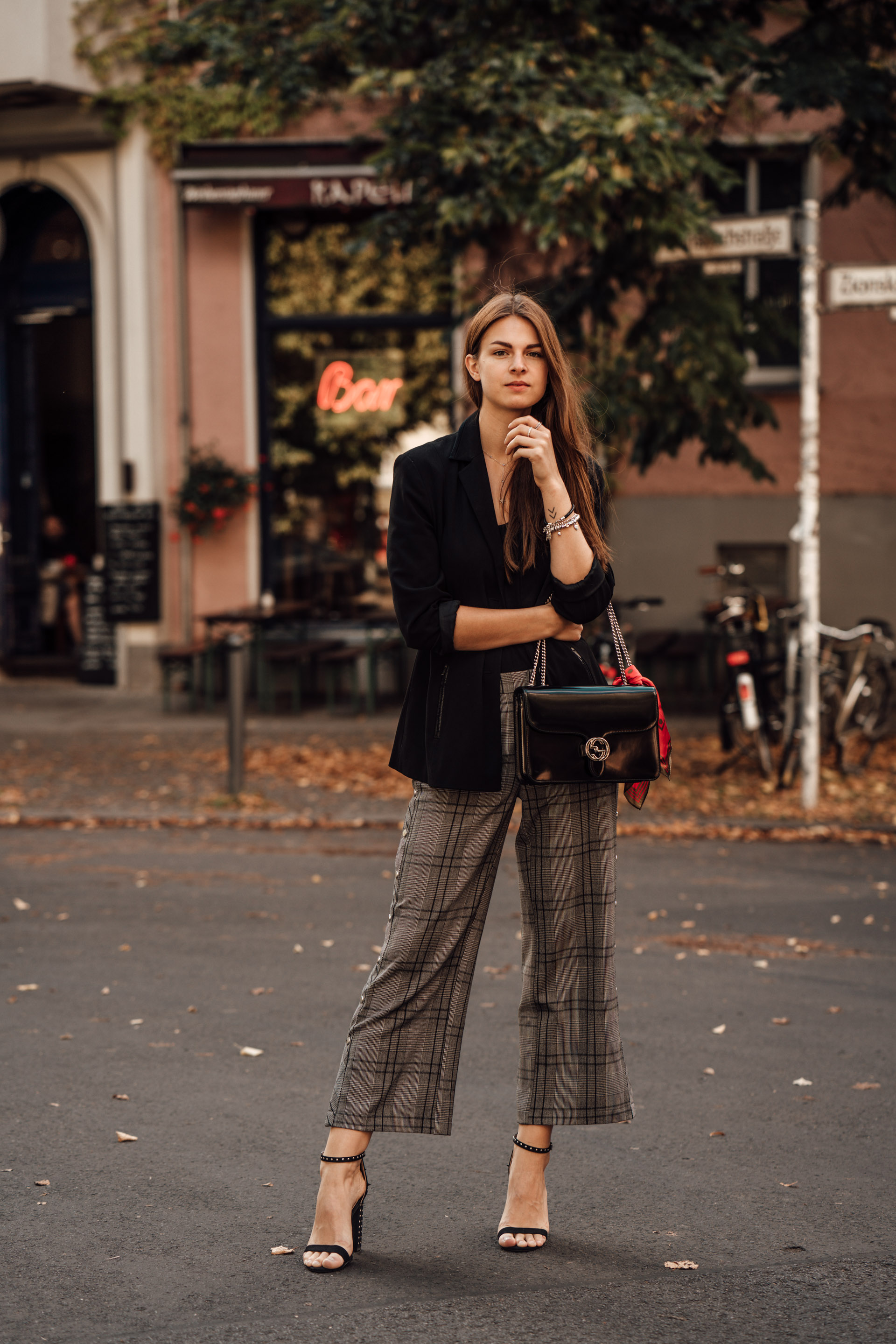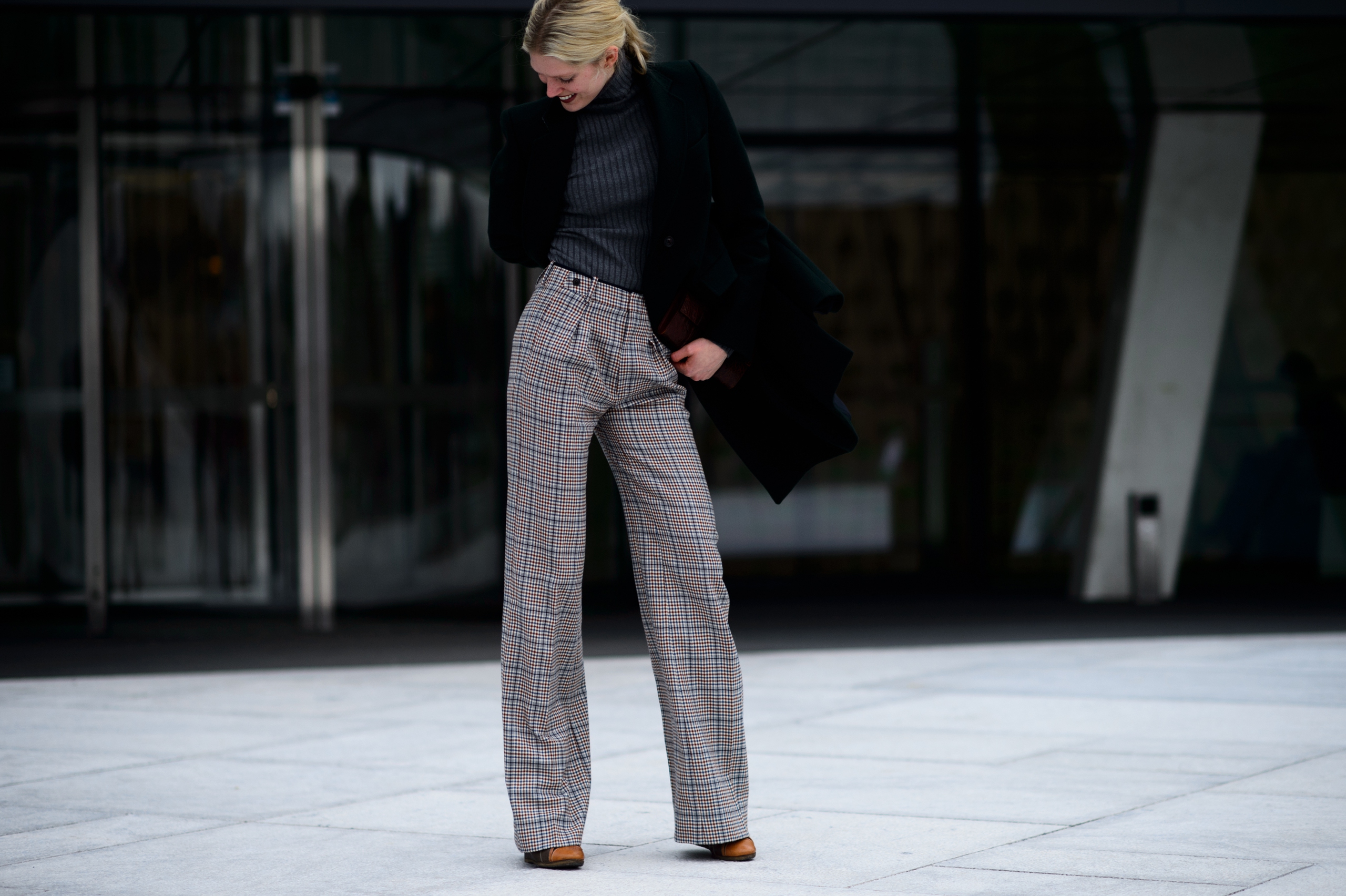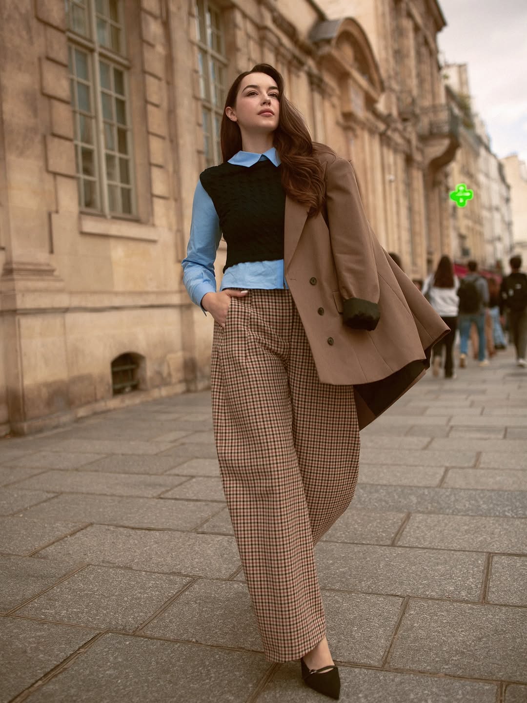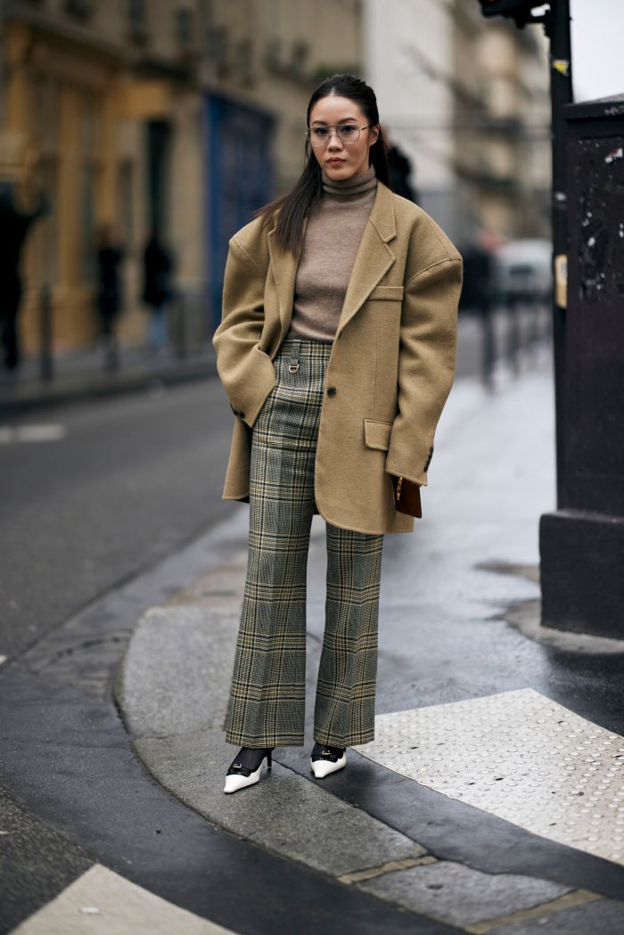 Trong cuộc sống thường ngày, từ những buổi gặp gỡ đến những bữa tối cùng bạn bè, chiếc quần kẻ ca rô trông thật hoàn hảo với kiểu quần cạp cao và ống rộng thoải mái. Bộ trang phục đa năng và nổi bật nhất bao gồm áo cổ lọ cùng tông và áo blazer oversized tinh tế. Bảng màu của bộ trang phục cũng dễ dàng chuyển đổi giữa nâu, xám, be và đen. Cuối cùng, giày dép mang đến nét nữ tính và duyên dáng.