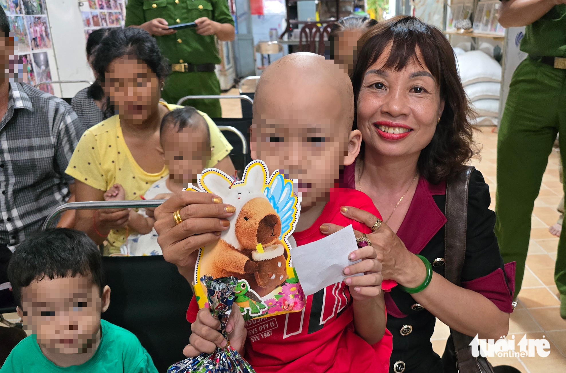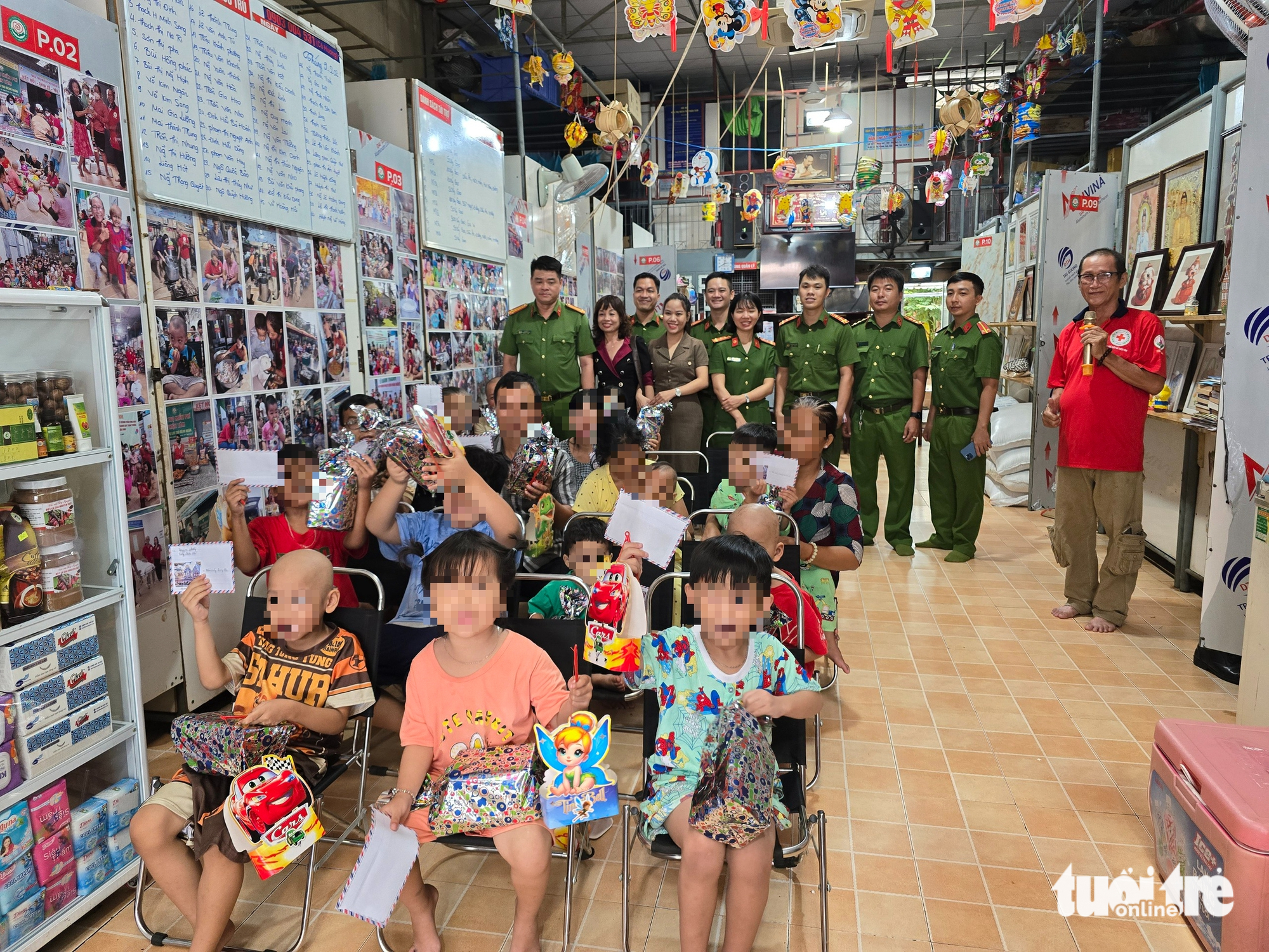 Chiều 3-10, Công an phường Tăng Nhơn Phú cùng các nhà hảo tâm tổ chức phát hàng trăm phần quà Trung thu cho trẻ em đang điều trị ung thư (ngoại trú) ở các nhà trọ 0 đồng, mái ấm tình thương... xung quanh Bệnh viện Ung bướu cơ sở 2 - Ảnh: MINH HÒA