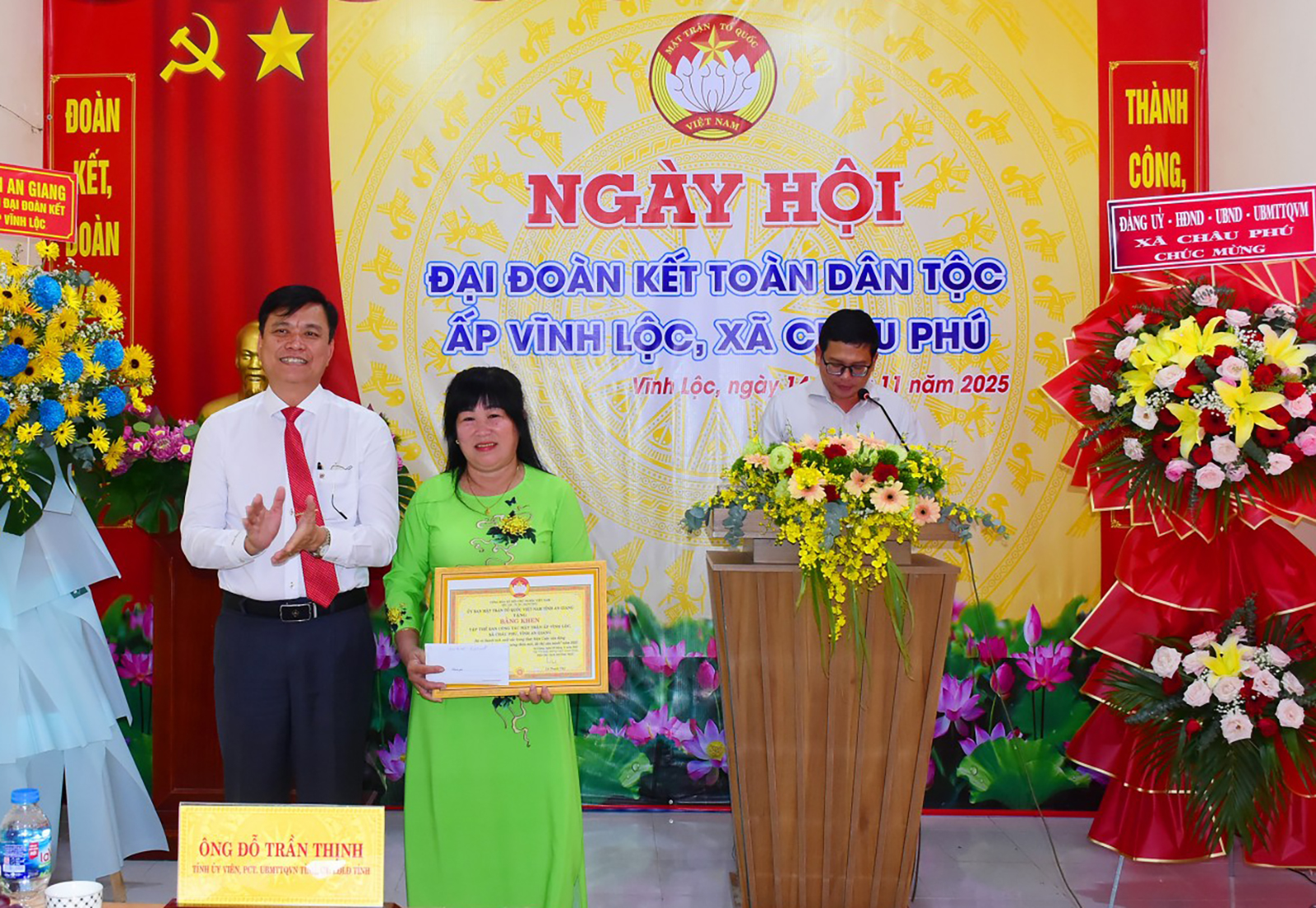 - Chiều 14/11, Phó Chủ tịch Ủy ban MTTQ Việt Nam tỉnh, Chủ tịch Liên đoàn Lao động tỉnh An Giang Đỗ Trần Thịnh đến dự Ngày hội Đại đoàn kết toàn dân tộc ấp Vĩnh Lộc, xã Châu Phú, nhân kỷ niệm 95 năm Ngày thành lập Mặt trận Dân tộc Thống nhất Việt Nam - Ngày truyền thống MTTQ Việt Nam (18/11/1930 - 18/11/2025).