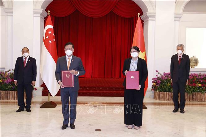 Chủ tịch nước Nguyễn Xuân Phúc với Thủ tướng Singapore Lý Hiển Long chứng kiến Lễ trao đổi thoả thuận hợp tác giữa 2 nước. Ảnh: Thống Nhất/TTXVN