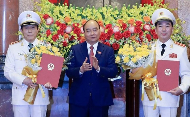 Chủ tịch nước Nguyễn Xuân Phúc trao Quyết định thăng cấp bậc hàm từ Trung tướng lên Thượng tướng đối với Thứ trưởng Bộ Công an Trần Quốc Tỏ và Lương Tam Quang. (Ảnh: Thống Nhất/TTXVN)