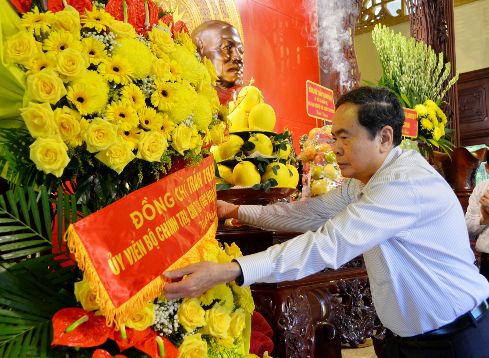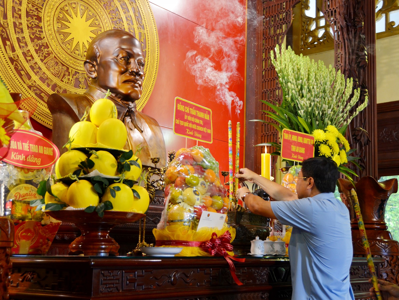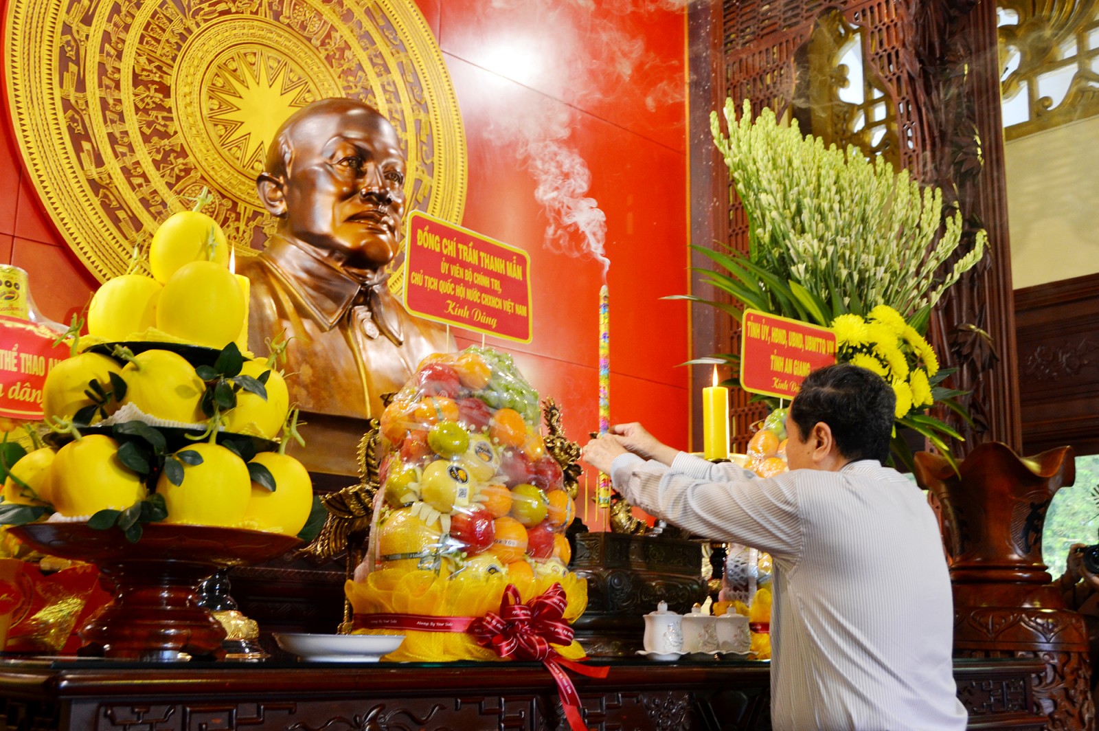 Tại đền thờ Chủ tịch Tôn Đức Thắng, Chủ tịch Quốc hội Trần Thanh Mẫn, cùng các thành viên đoàn công tác Trung ương và tỉnh An Giang thành kính dành phút mặc niệm, dâng hương tưởng nhớ Chủ tịch Tôn Đức Thắng.