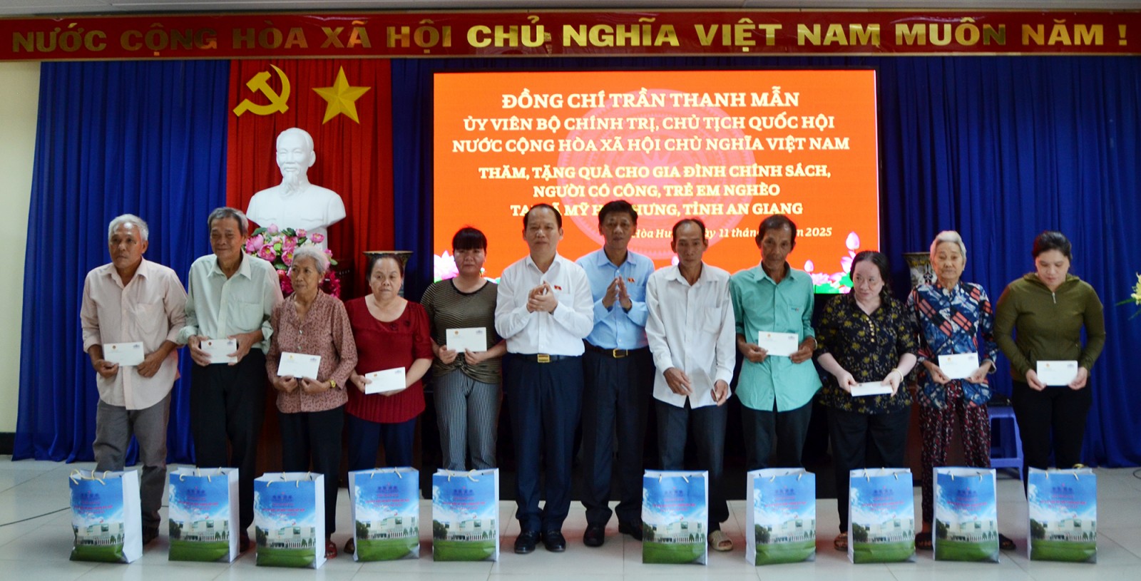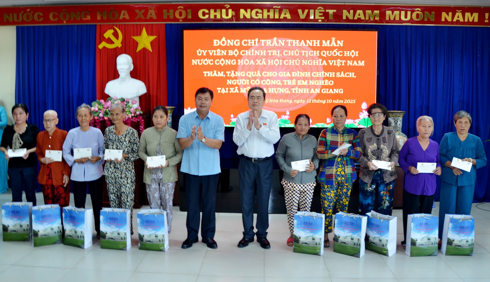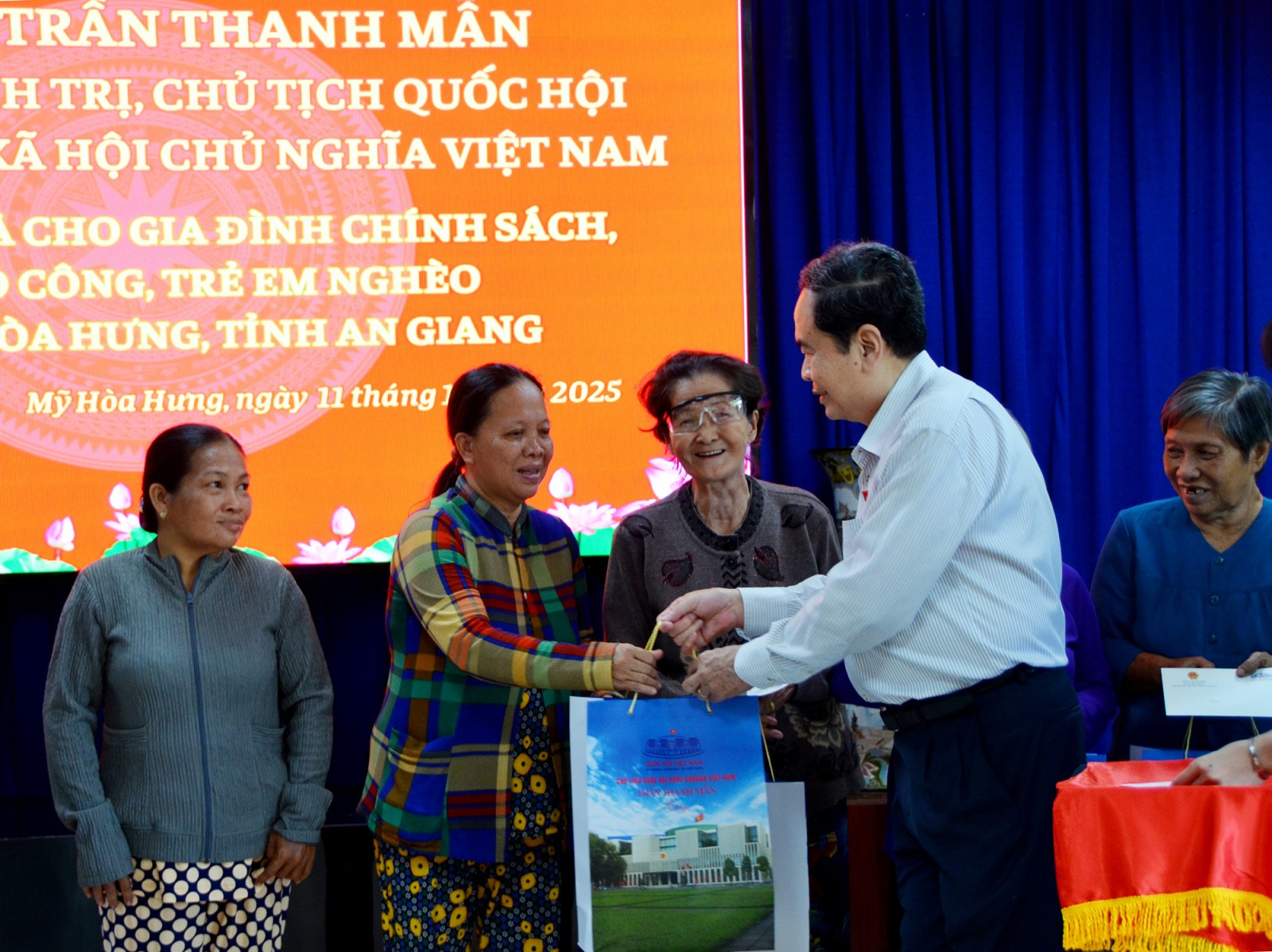 Dịp này, Chủ tịch Quốc hội Trần Thanh Mẫn trao 200 phần quà cho gia đình chính sách, người có công, trẻ em nghèo trên địa bàn xã Mỹ Hòa Hưng, hai phường Vĩnh Tế và Châu Đốc.